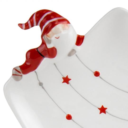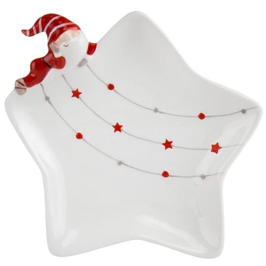 Блюдо виготовлене із кераміки у вигляді зірки, білого кольору із червоним Сантою та зірками.