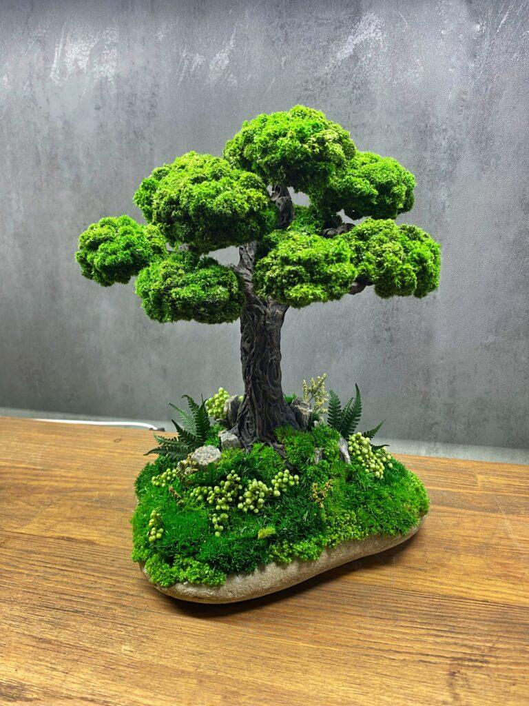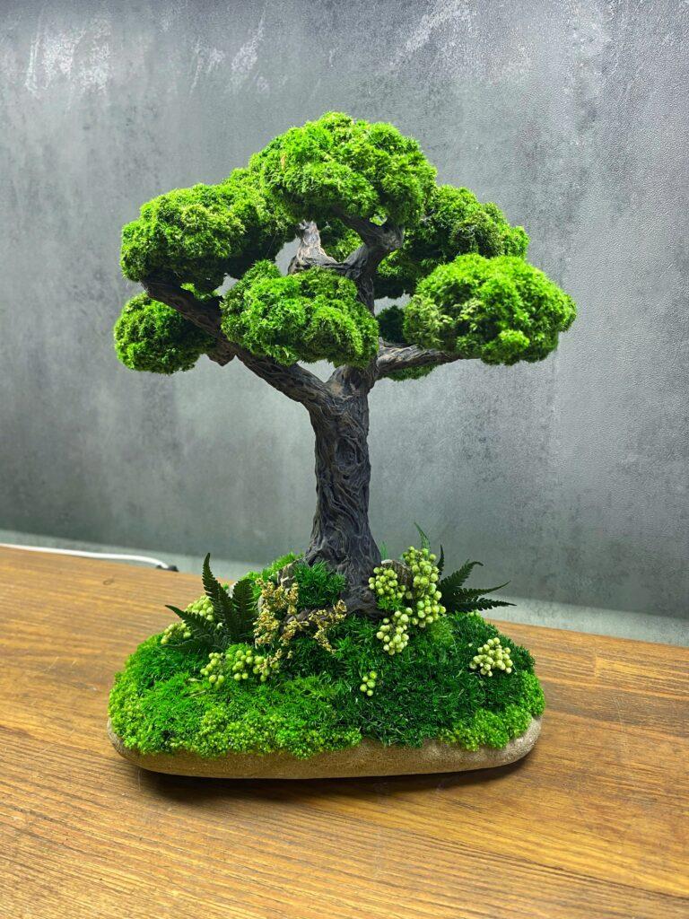 Бонсай виготовлений зі стабілізованих рослин. Не вимагає догляду, поливу та сонячного світла.