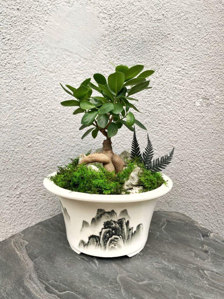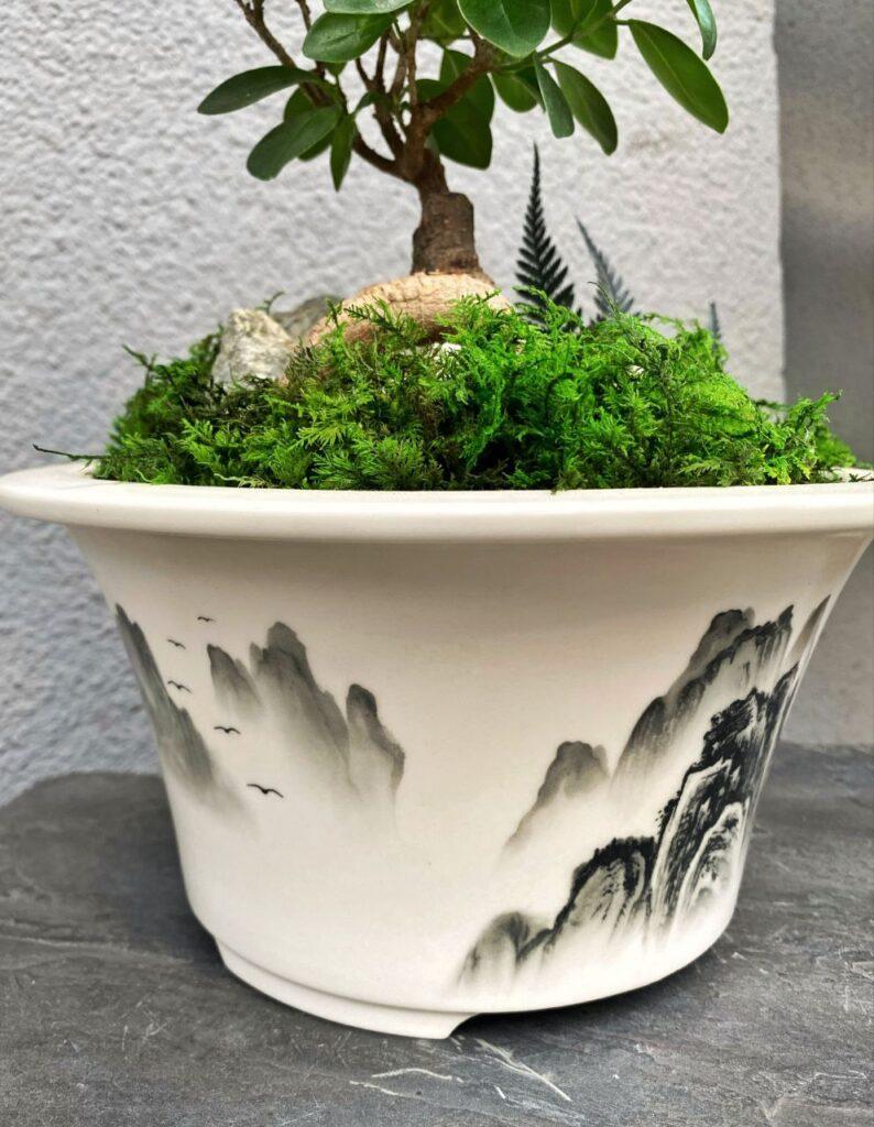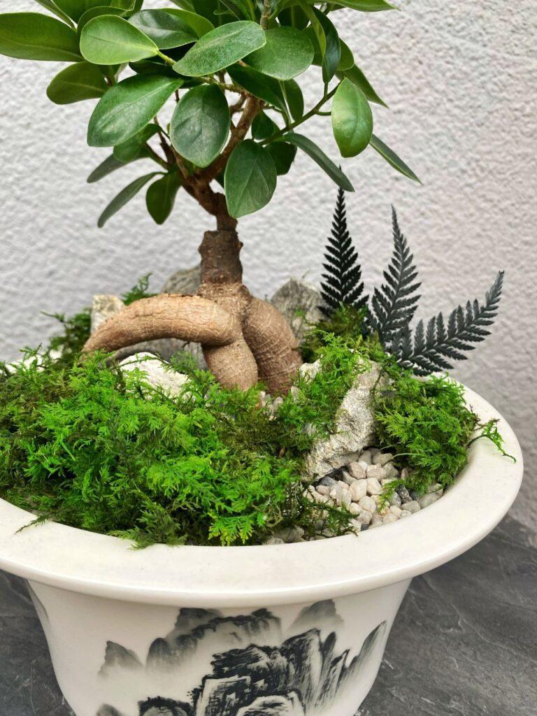 Вишуканий бонсай у керамічному горщику з традиційним китайським орнаментом – ідеальне рішення для інтер’єру. Декоративне дерево в оточенні стабілізованого моху та штучних декоративних елементів створює відчуття гармонії та спокою. Завдяки компактному розміру композиція підійде для дому чи офісу.