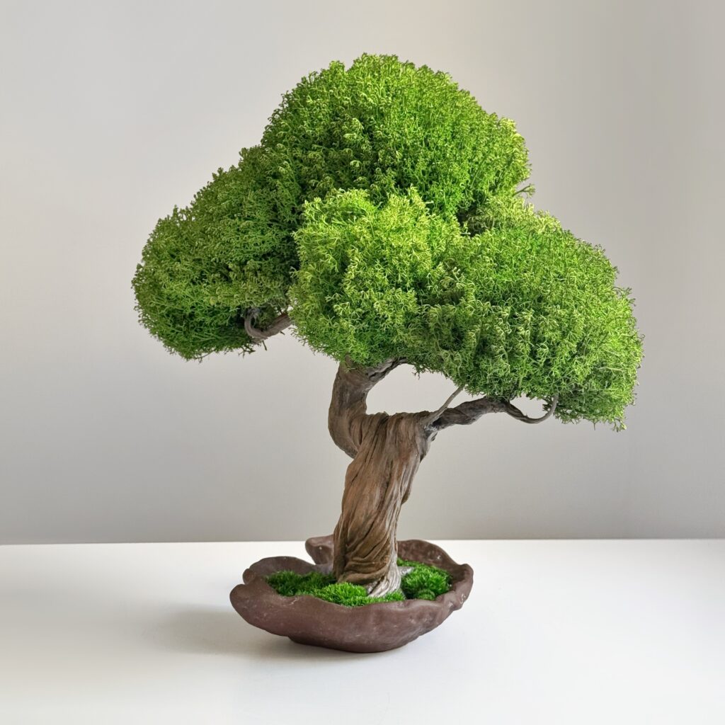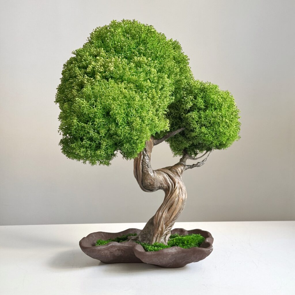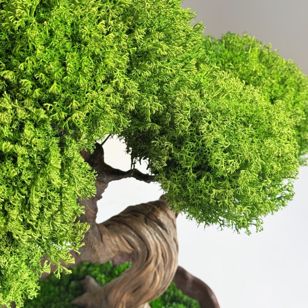 Бонсай зі стабілізованого моху — це стильна прикраса, створена вручну з увагою до деталей. Його скручений стовбур з натурального матеріалу та пишна зелена крона роблять його виразним акцентом у будь-якому інтер’єрі. Не потребує догляду, не вицвітає, не осипається й зберігає свіжий вигляд до 7 років. Ідеально підходить для дому, офісу, студії, кабінету чи зони відпочинку.
