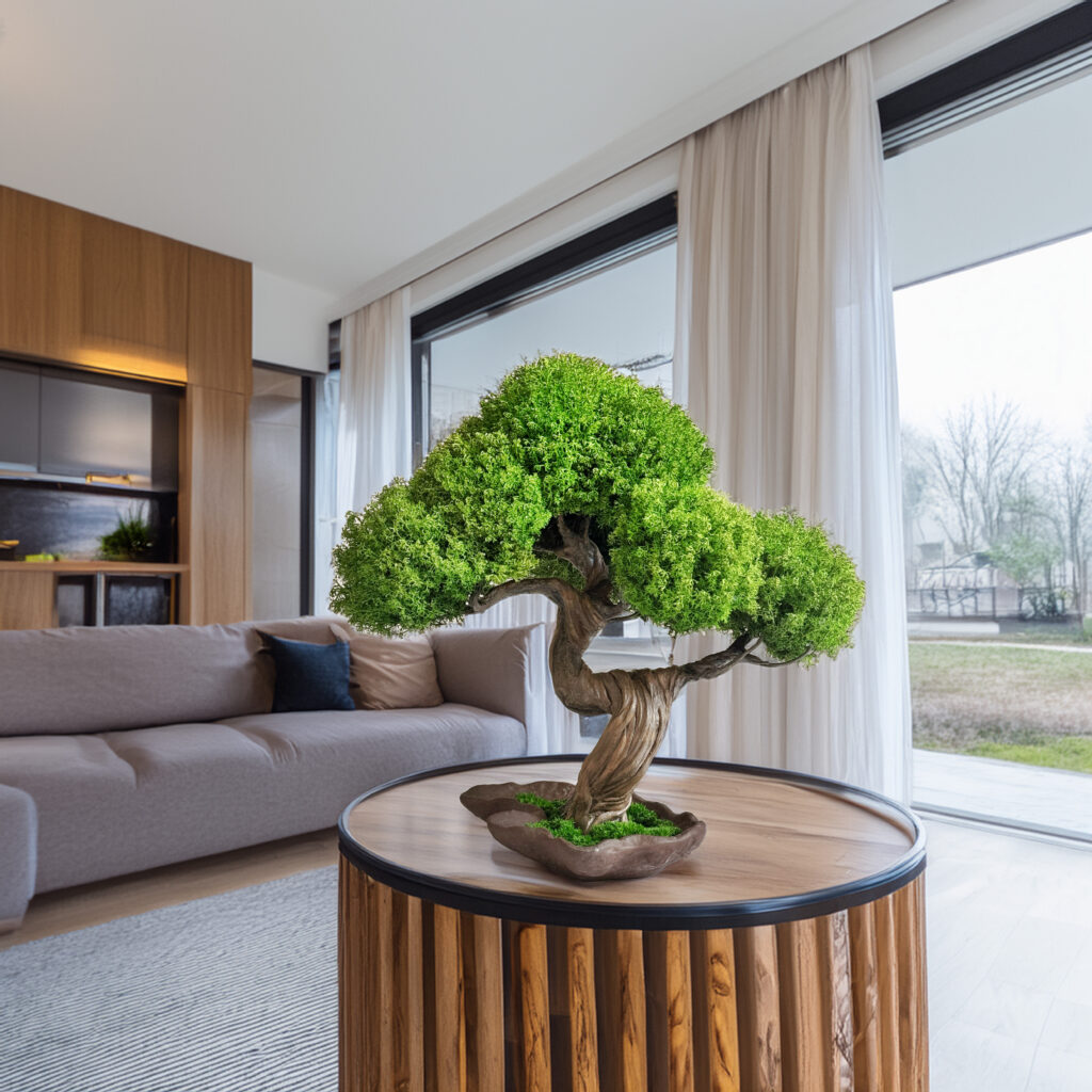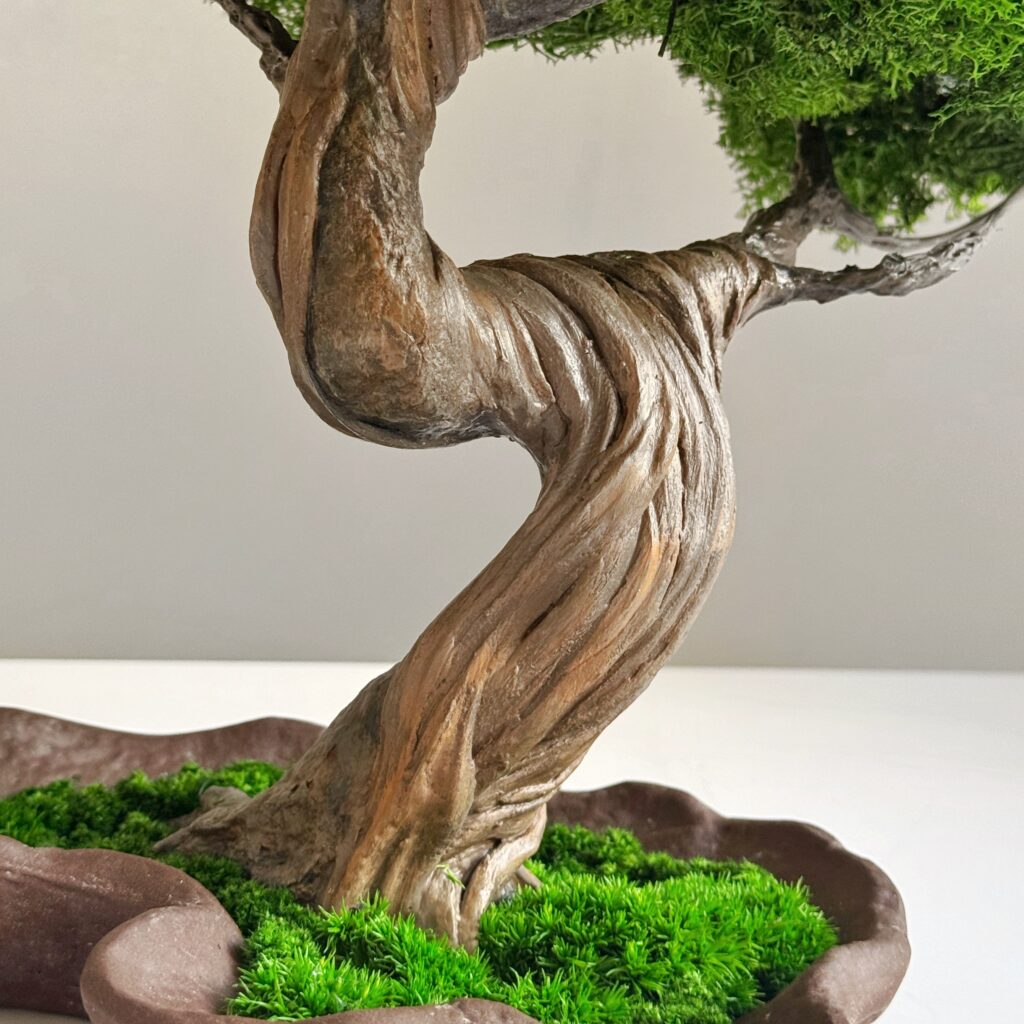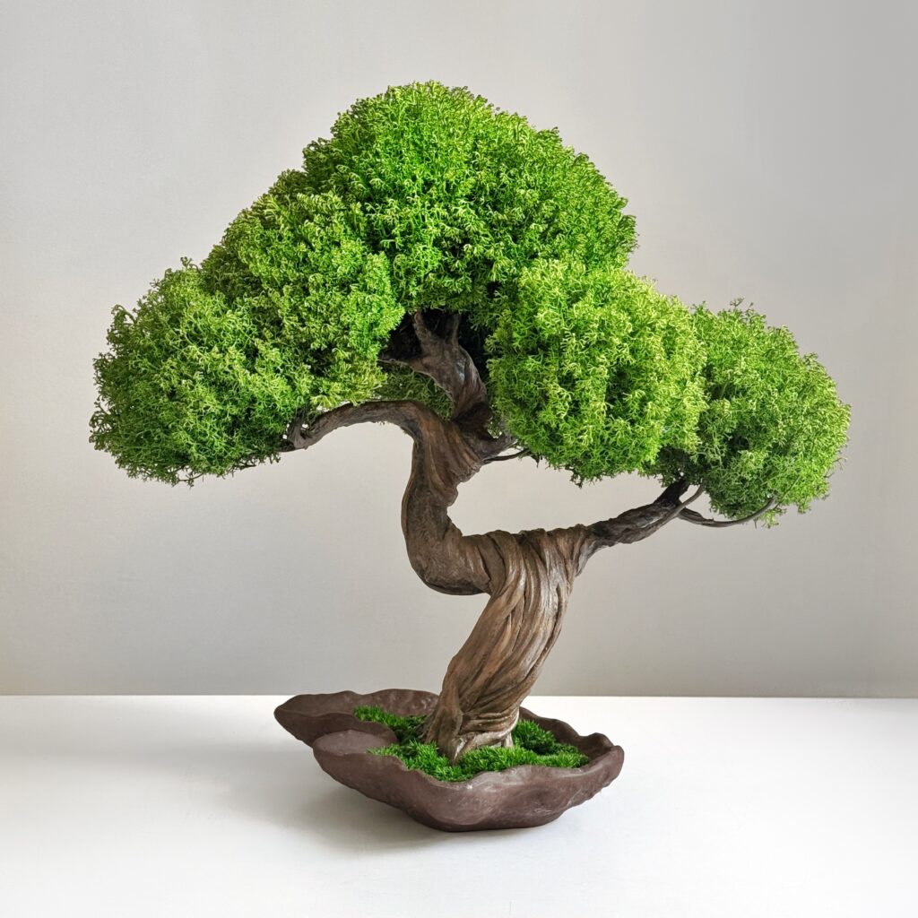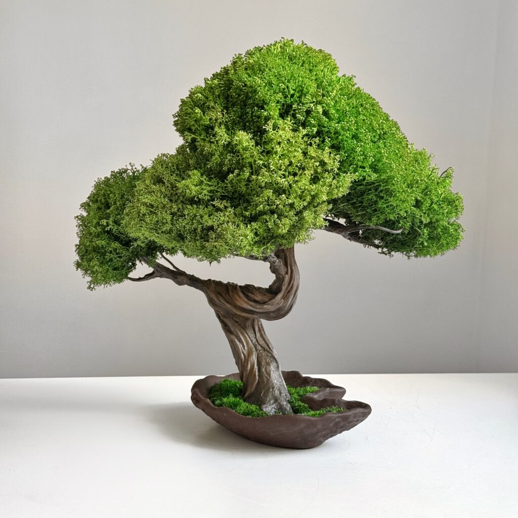 Бонсай зі стабілізованого моху — це стильна прикраса, створена вручну з увагою до деталей. Його скручений стовбур з натурального матеріалу та пишна зелена крона роблять його виразним акцентом у будь-якому інтер’єрі. Не потребує догляду, не вицвітає, не осипається й зберігає свіжий вигляд до 7 років. Ідеально підходить для дому, офісу, студії, кабінету чи зони відпочинку.