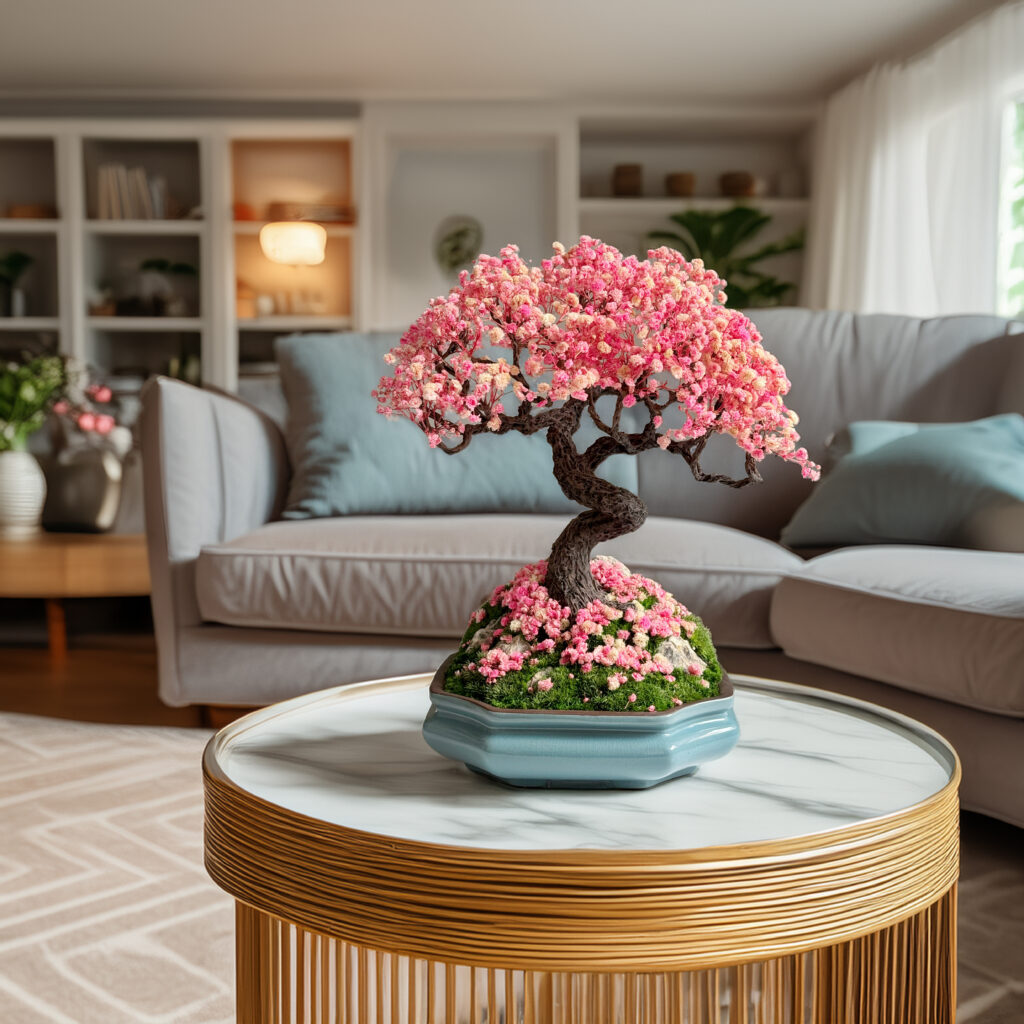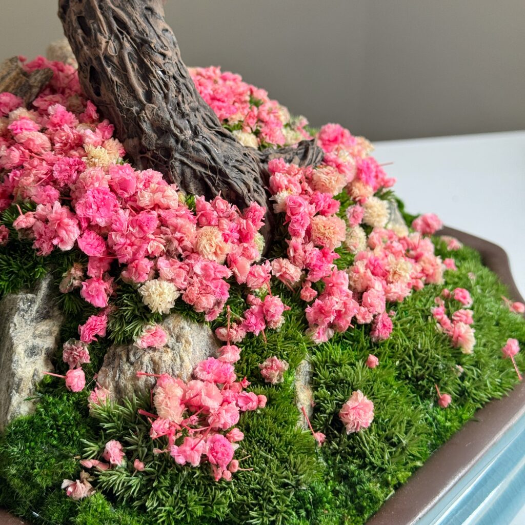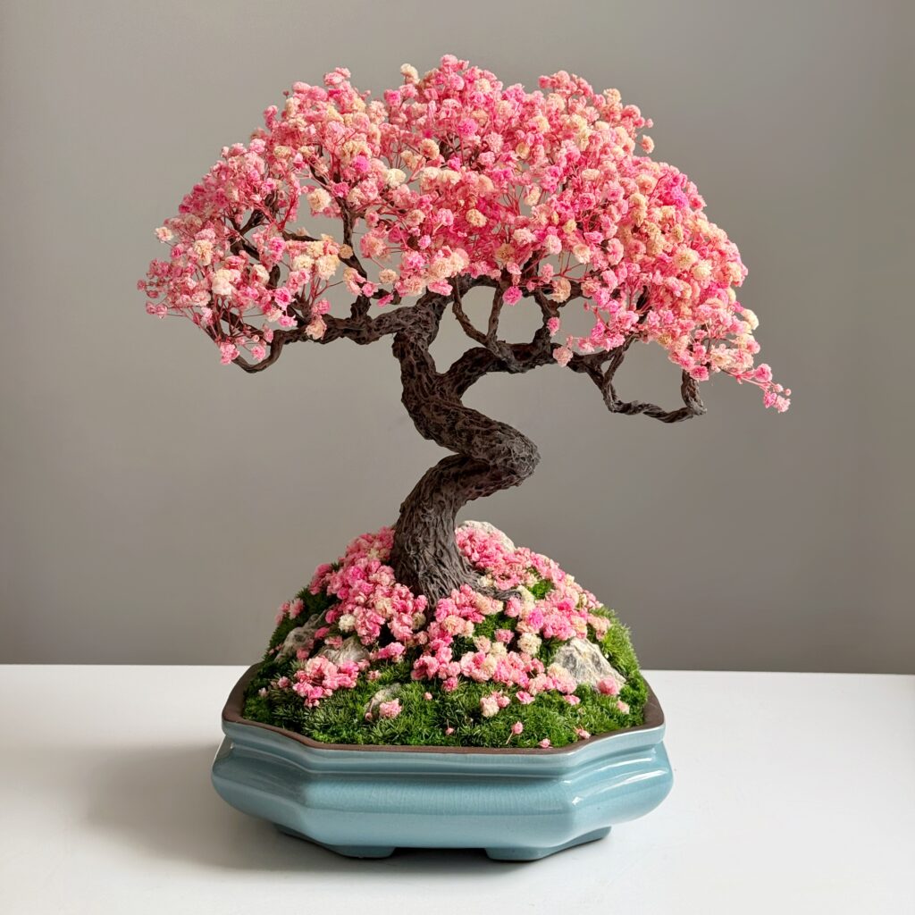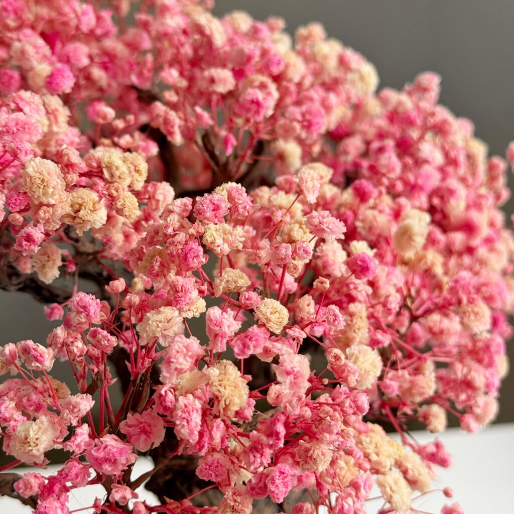 Елегантна композиція бонсай зі стабілізованих рослин – це витвір мистецтва, який поєднує в собі природну красу та довговічність. Ніжні рожеві квіти гіпсофіли створюють ефект квітучої сакури, надаючи інтер’єру витонченості та гармонії.