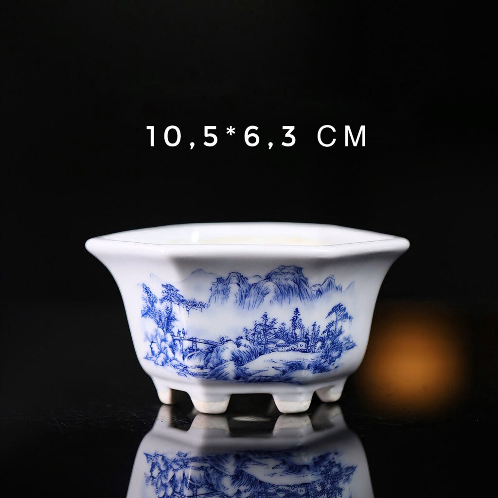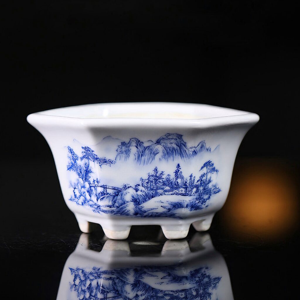 Бонсайниця із витонченим розписом у синіх тонах — чудове рішення для поціновувачів східної естетики та мистецтва бонсай. Біла глянцева поверхня та рельєфні ніжки підкреслюють витонченість форми та роблять виріб не лише функціональним, а й декоративним елементом інтер’єру. Ідеально підходить для мініатюрних дерев бонсай, моху чи декоративних композицій. Міцна кераміка забезпечує довговічність, а акуратні деталі надають унікальності кожній композиції.