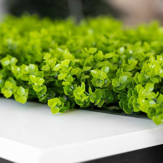 Ця декоративна панель ідеально підходить для оформлення інтер’єрів, створення зелених стін та фотозон. На звороті розміщена пластикова решітка з гачками для зручного монтажу на різні поверхні. Компактна, гнучка та щільна структура дозволяє легко створювати рівні вертикальні або горизонтальні покриття. Панель не потребує догляду та стійка до зовнішніх умов, що робить її універсальним рішенням для приміщень, вітрин, зон відпочинку та оформлення просторів HoReCa.