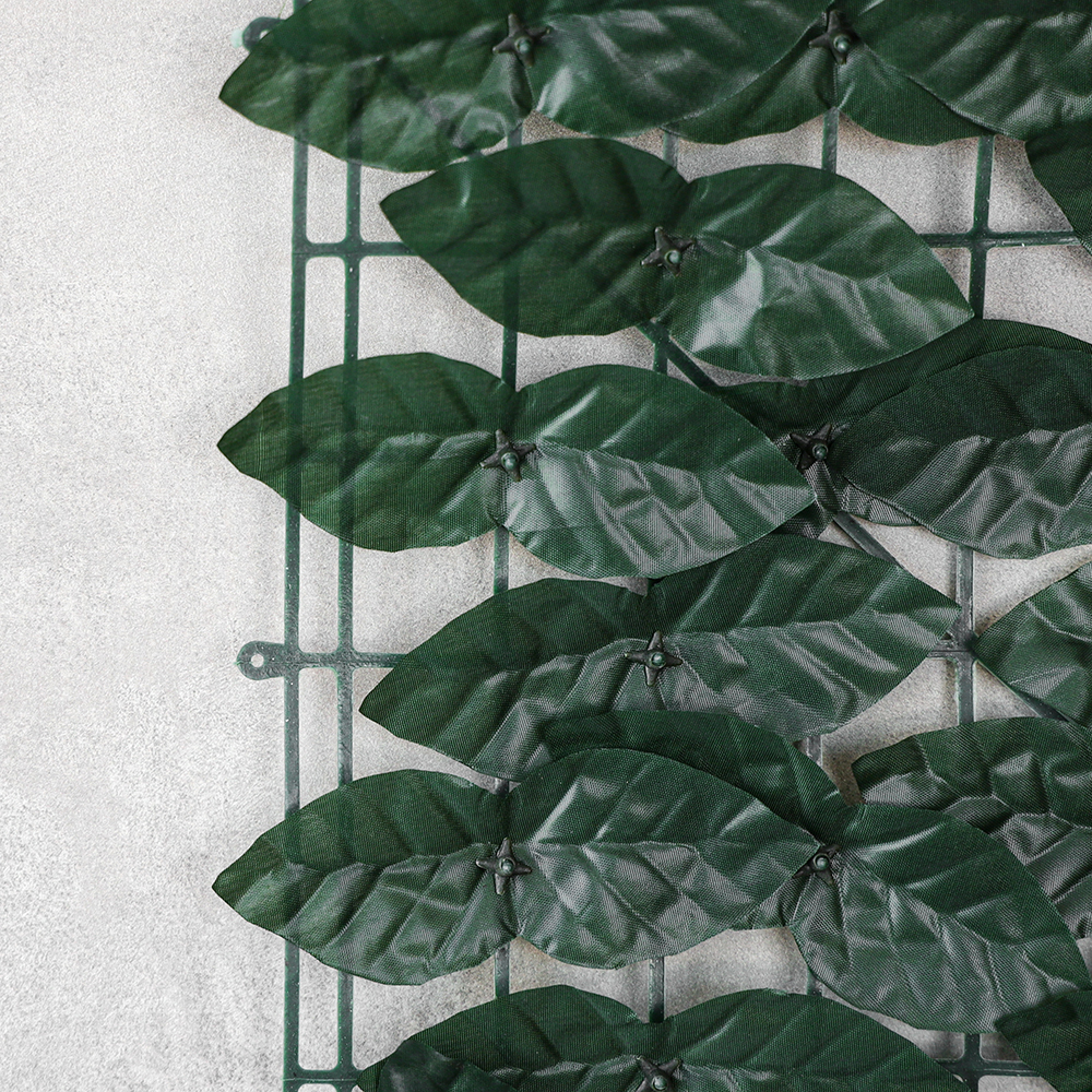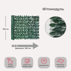 Довжина покриття – 300 см, ширина – 100 см, висота – 0,7 см. Декоративне модульне покриття з реалістичним листям на основі із міцного поліетилену — це універсальне рішення для озеленення інтер’єру та екстер’єру. Листя виготовлене з поліестеру, має природну форму та приємну текстуру, що створює ефект живої зеленої стіни. Гнучка сітка дозволяє зручно монтувати панель на будь-які поверхні — стіни, огорожі, фасади або перегородки. Таке покриття надає простору свіжості, затишку й візуально оживляє навіть найпростішу площину. Ідеально для оформлення кафе, салонів, фотозон, вітрин або прибудинкових територій.