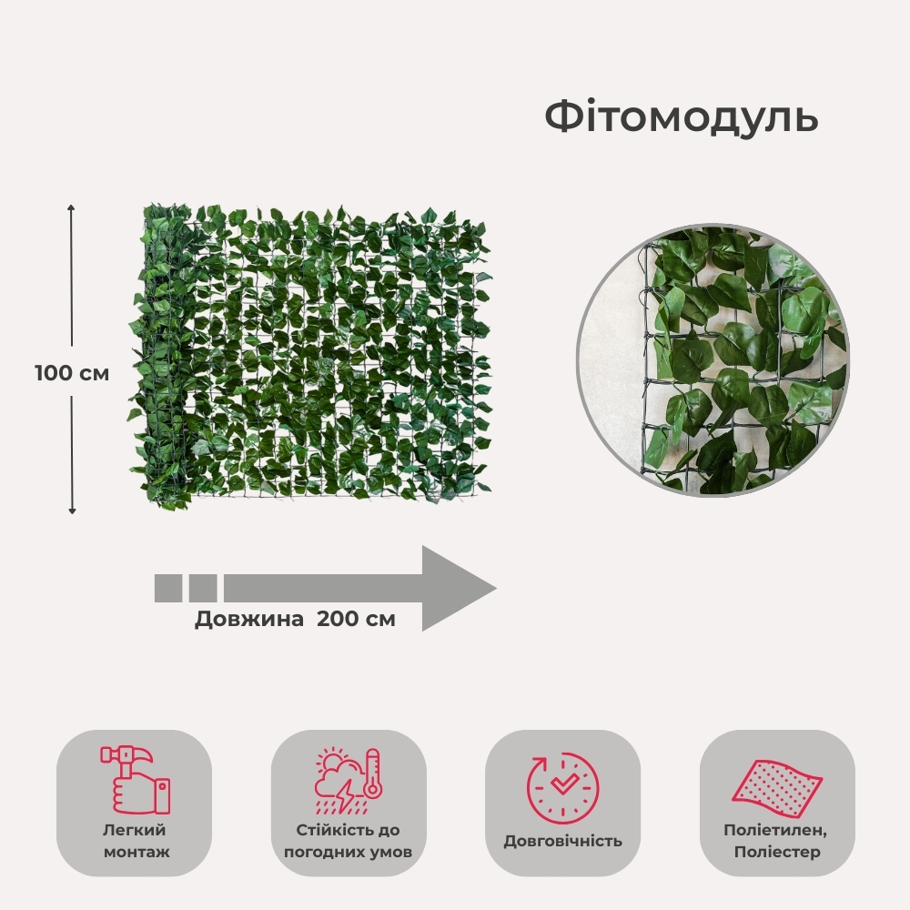 Довжина покриття – 200 см, ширина – 100 см, висота – 2 см. Декоративне модульне покриття з реалістичним листям на основі із міцного поліетилену — це універсальне рішення для озеленення інтер’єру та екстер’єру. Листя виготовлене з поліестеру, має природну форму та приємну текстуру, що створює ефект живої зеленої стіни. Гнучка сітка дозволяє зручно монтувати панель на будь-які поверхні — стіни, огорожі, фасади або перегородки. Таке покриття надає простору свіжості, затишку й візуально оживляє навіть найпростішу площину. Ідеально для оформлення кафе, салонів, фотозон, вітрин або прибудинкових територій.