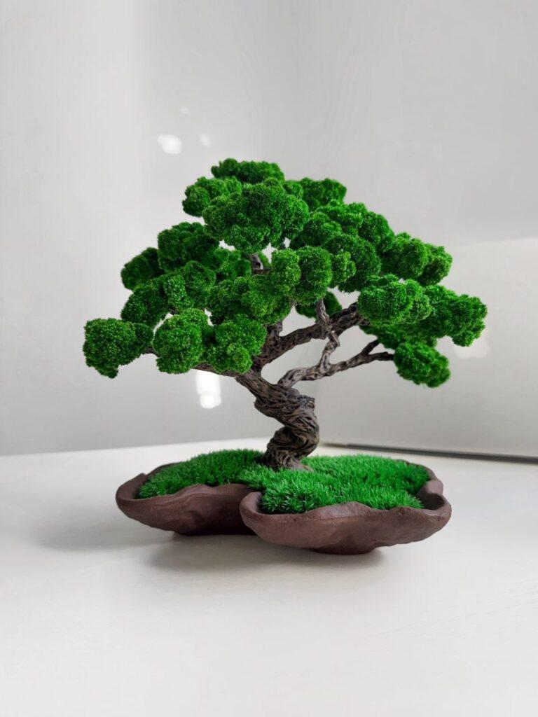 Ефектне декоративне дерево у керамічній хвилястій плошці стане стильним доповненням інтер’єру. Основу дерева прикрашено плошкою стабілізованого моху, який виглядає природно та зберігає свою свіжість без догляду. Унікальний дизайн виробу робить його ідеальним подарунком або оригінальним акцентом для дому чи офісу.