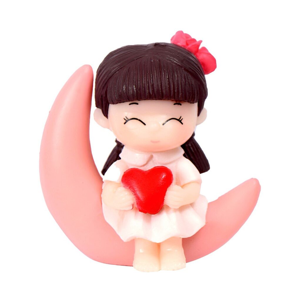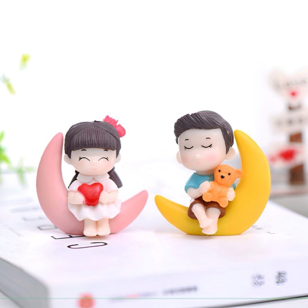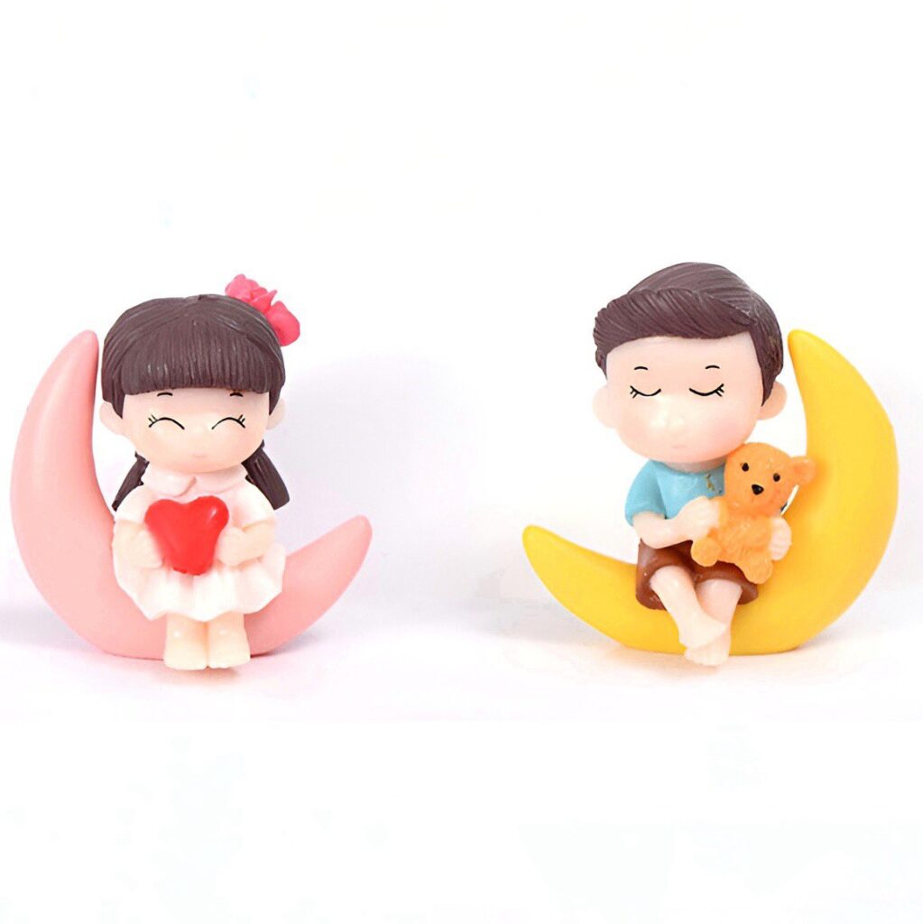 Милі фігурки хлопчика та дівчинки, що сидять на півмісяцях, стануть стильним акцентом для флораріуму, міні-саду чи композиції в кашпо. Дівчинка тримає червоне сердечко, а хлопчик — плюшевого ведмедика, створюючи атмосферу затишку й ніжності. Компактний розмір дозволяє використовувати їх у декоративних композиціях, на полицях, столах і як милий подарунок.