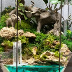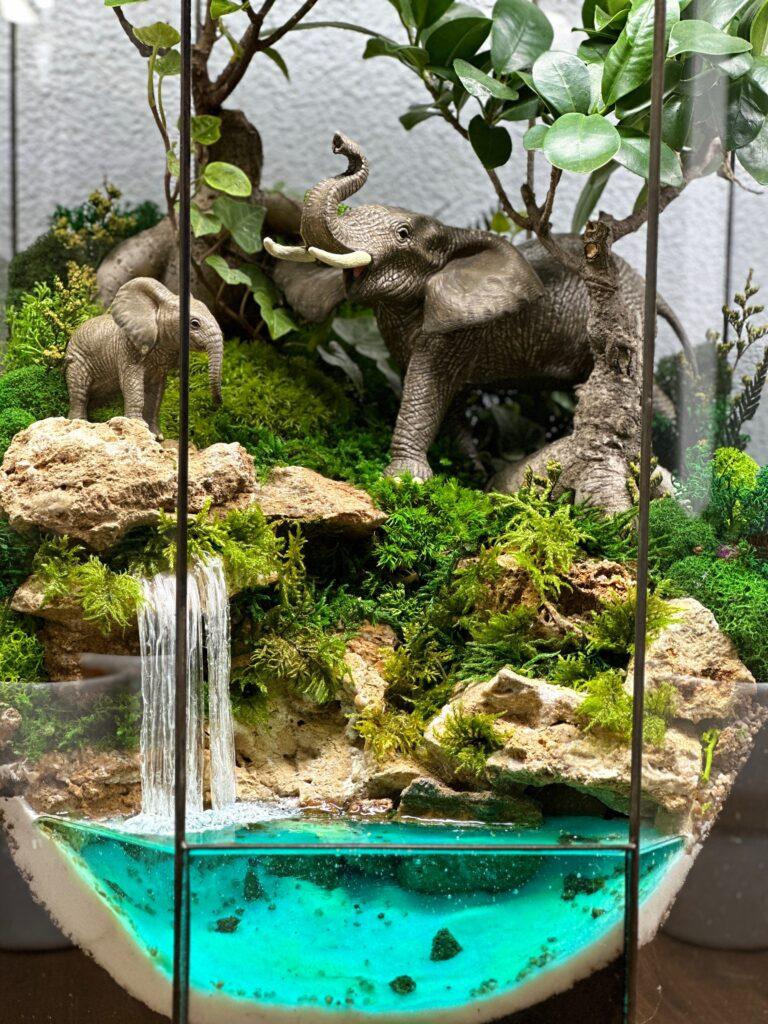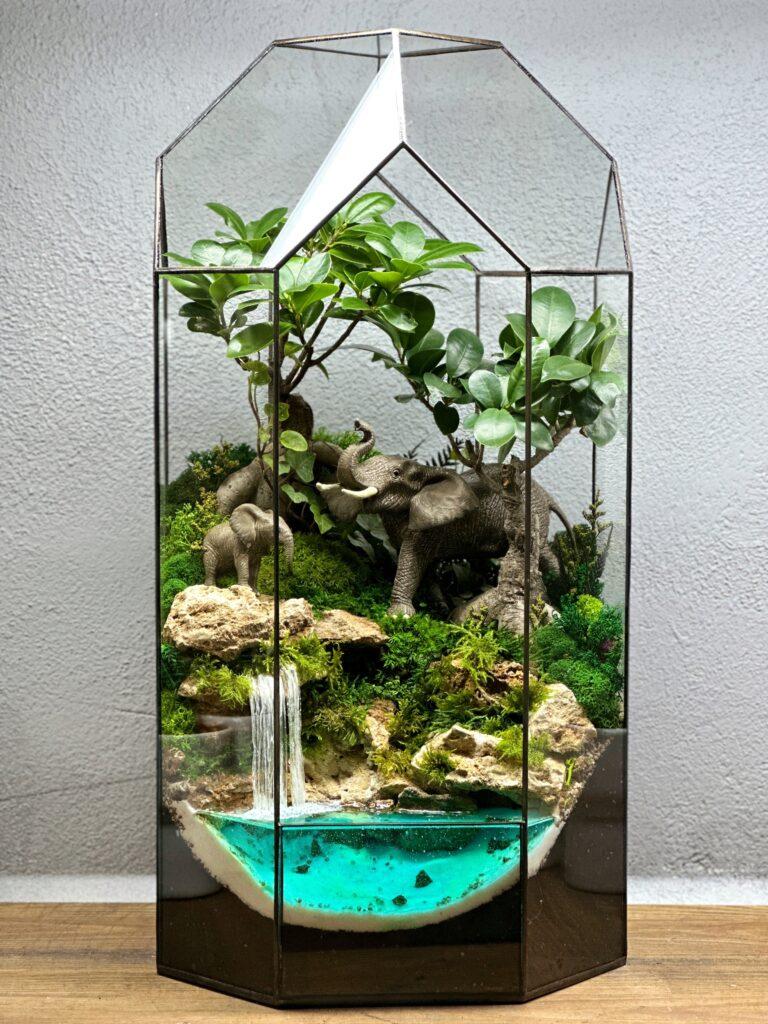 Флораріум «Джунглі» з двома деревами бонсай, фігурками слонів та водоспадом.