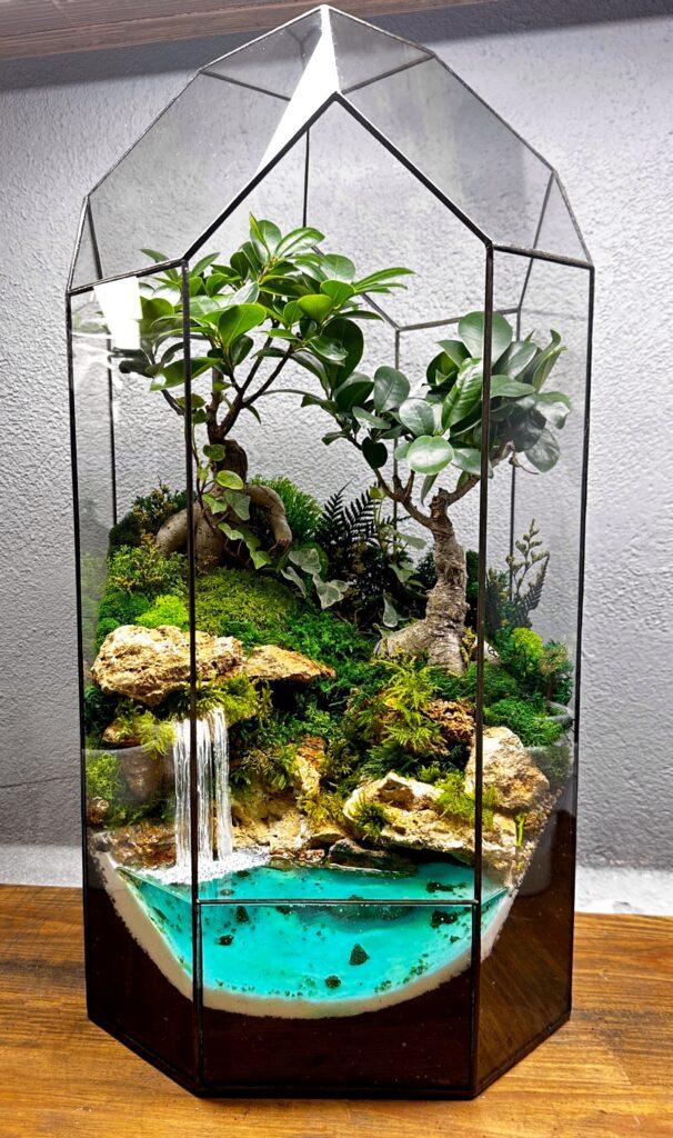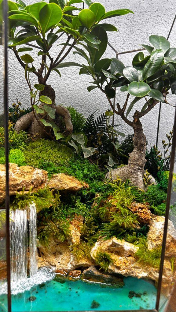 Флораріум «Джунглі» з двома деревами бонсай та водоспадом.