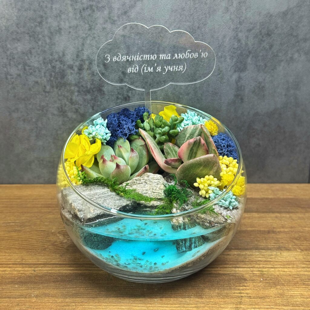 Такий флораріум стане чудовим подарунком для вчителя на 1 вересня, до Дня вчителя, а також як знак вдячності чи уваги до рідних і друзів. Завдяки стильному дизайну та персоналізованому напису він виглядає сучасно, дорого й залишає теплі емоції на довгі роки.