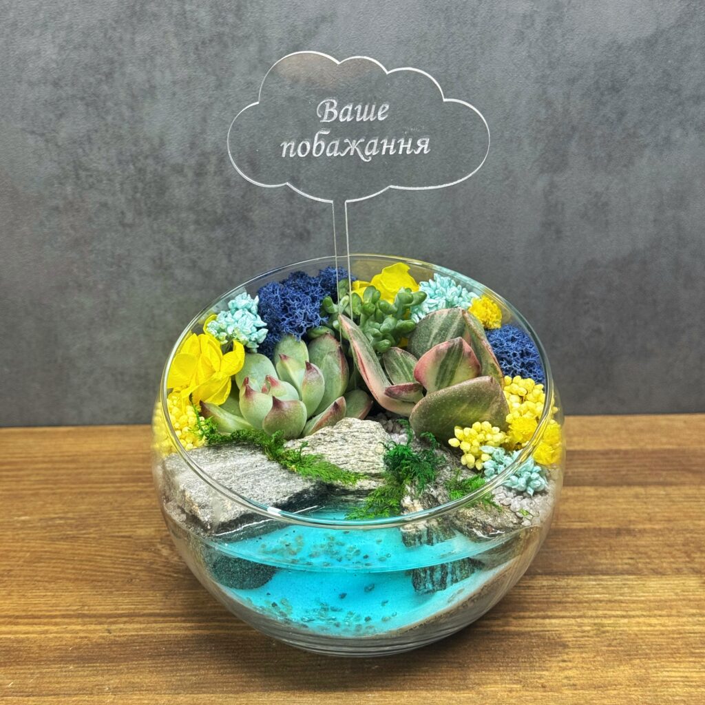 Топер з прозорого акрилу з гравіюванням стане яскравим акцентом у вашому подарунку. Його можна додати до кашпо з букетом, флораріуму або деревця з побажанням.