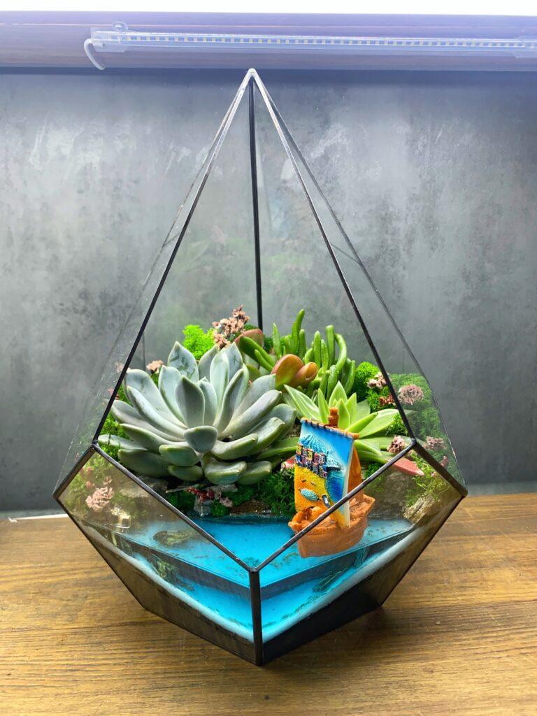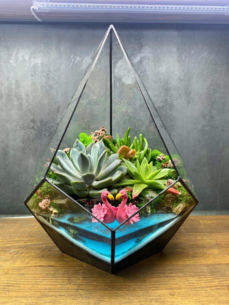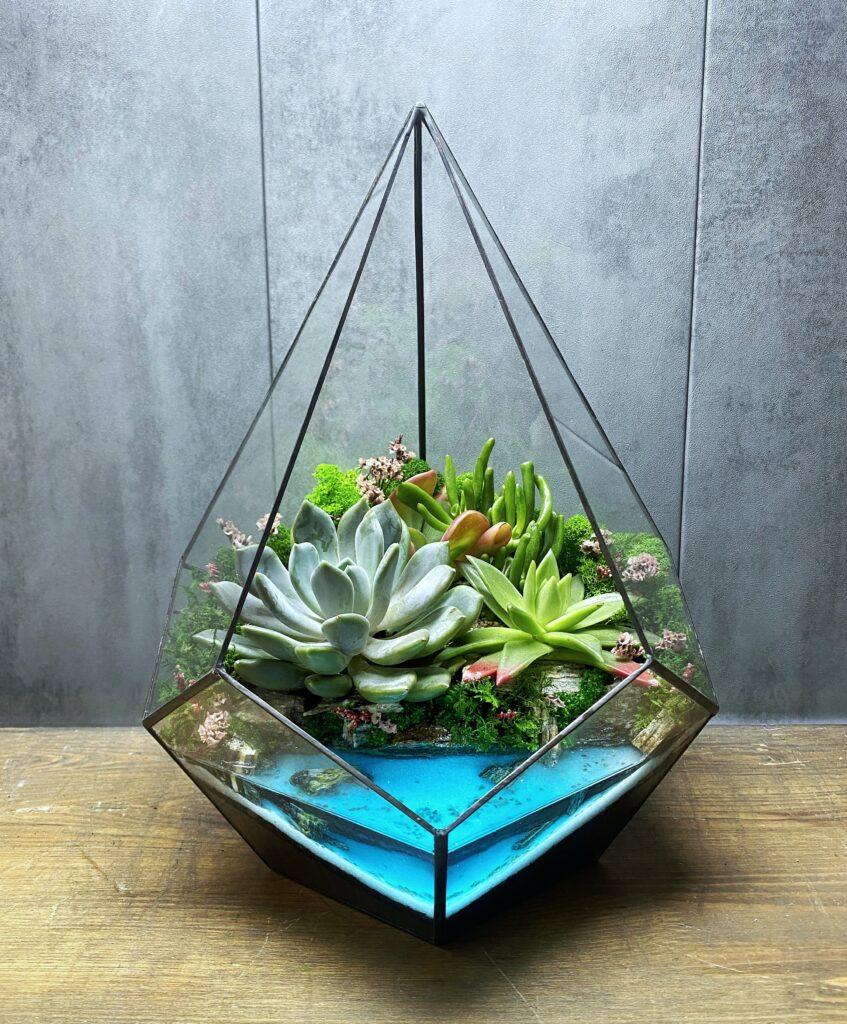 Сукуленти, використані у флораріумі, відомі своєю витривалістю та невибагливістю у догляді. Вони зберігають свою красу протягом тривалого часу, не потребуючи складного догляду. Імітація водойми додає композиції глибини та реалістичності, створюючи враження справжнього тропічного оазису.