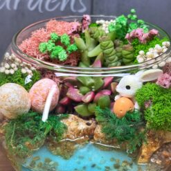 Флораріум із сукулентами та імітацією водойми не лише прикрасить інтер’єр, але й стане символом вашої турботи та уваги. Він підходить для прикрашання як домашнього інтер’єру, так і офісного простору, додаючи нотку спокою та гармонії. Цей флораріум не потребує складного догляду, лише мінімального поливу та захисту від прямих сонячних променів.
