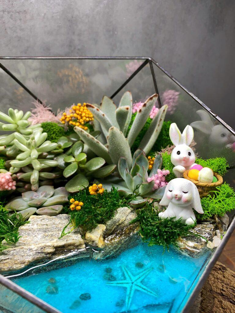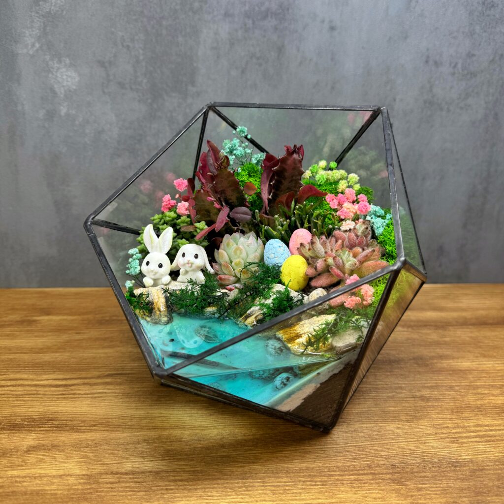 Флораріум із сукулентами та імітацією водойми не лише прикрасить інтер’єр, але й стане символом вашої турботи та уваги. Він підходить для прикрашання як домашнього інтер’єру, так і офісного простору, додаючи нотку спокою та гармонії. Цей флораріум не потребує складного догляду, лише мінімального поливу та захисту від прямих сонячних променів.