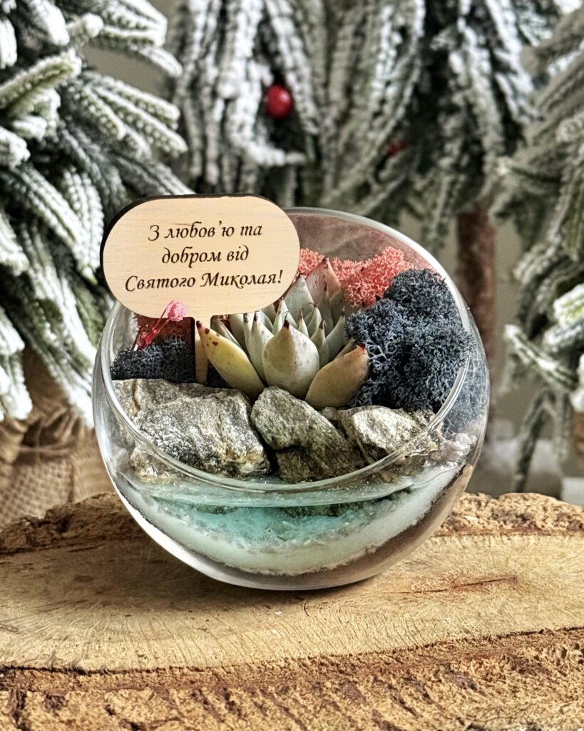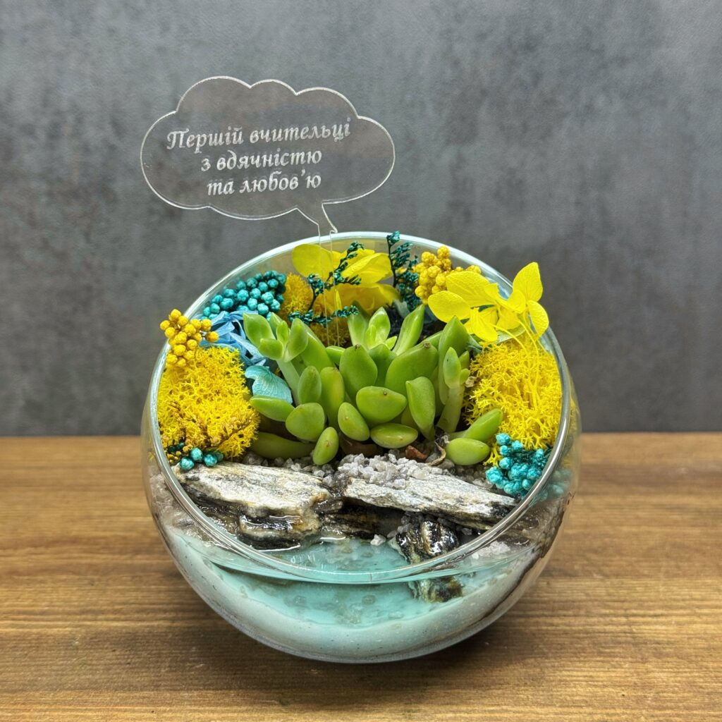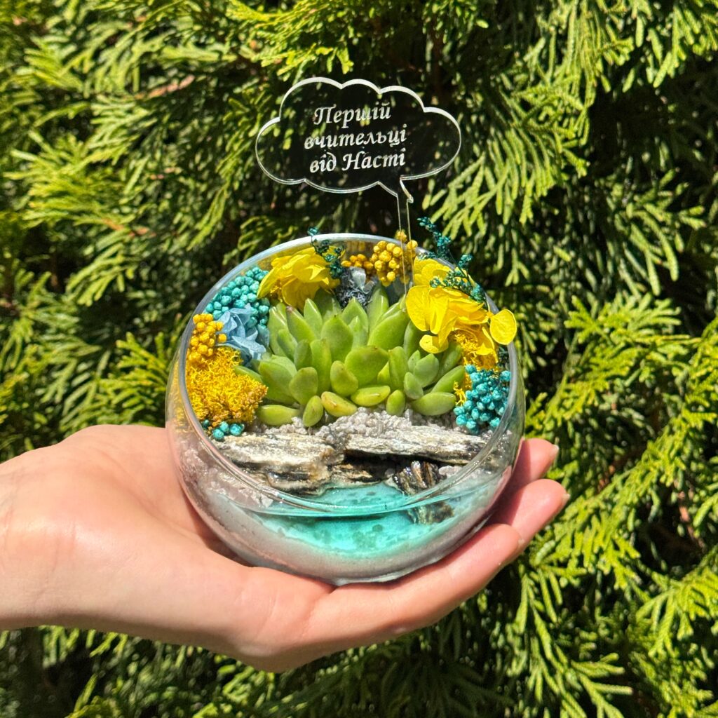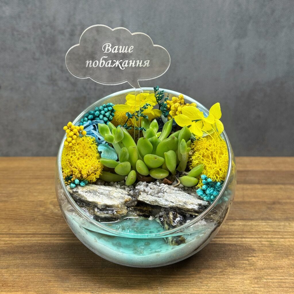 Міні‑флораріум зі скляної кулі з живим сукулентом і акриловим топером — стильний подарунок з українським акцентом.