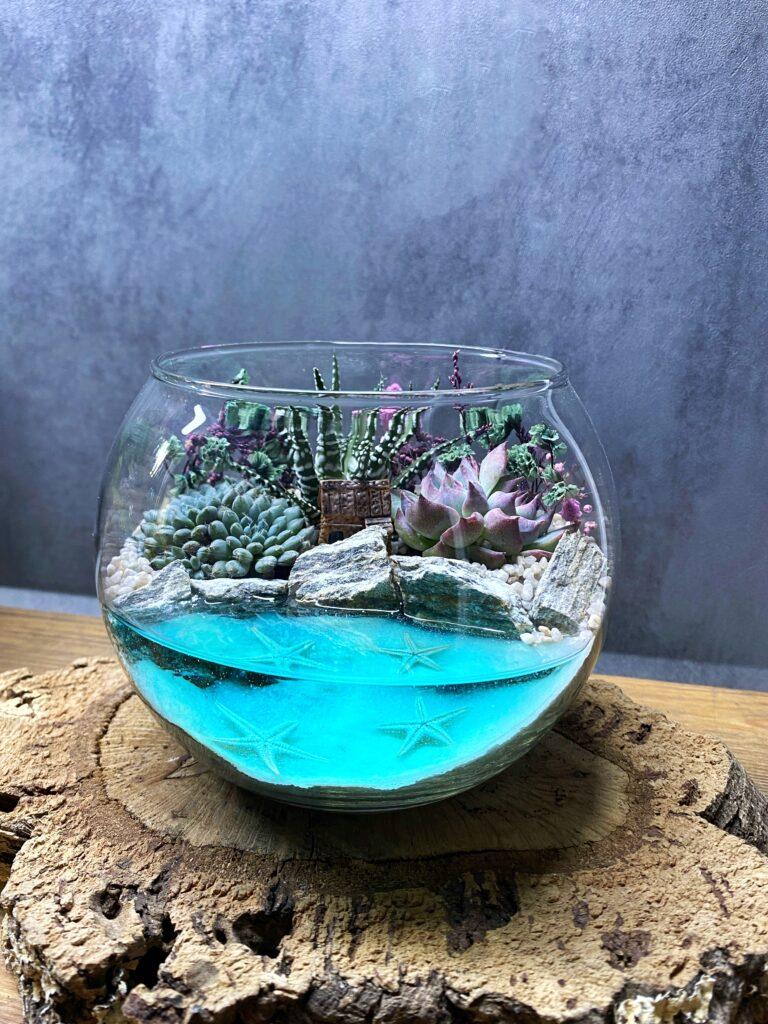 Флораріум із сукулентами та імітацією водойми не лише прикрасить інтер’єр, але й стане символом вашої турботи та уваги. Він підходить для прикрашання як домашнього інтер’єру, так і офісного простору, додаючи нотку спокою та гармонії. Цей флораріум не потребує складного догляду, лише мінімального поливу та захисту від прямих сонячних променів.