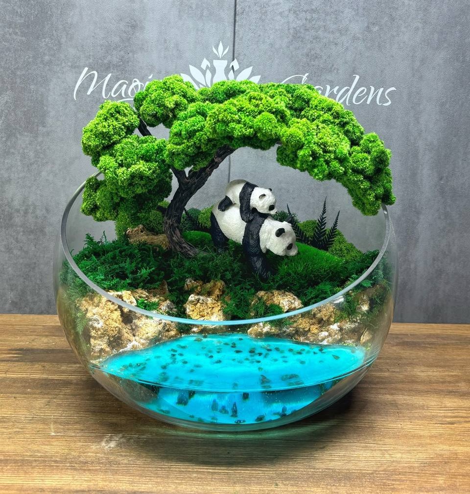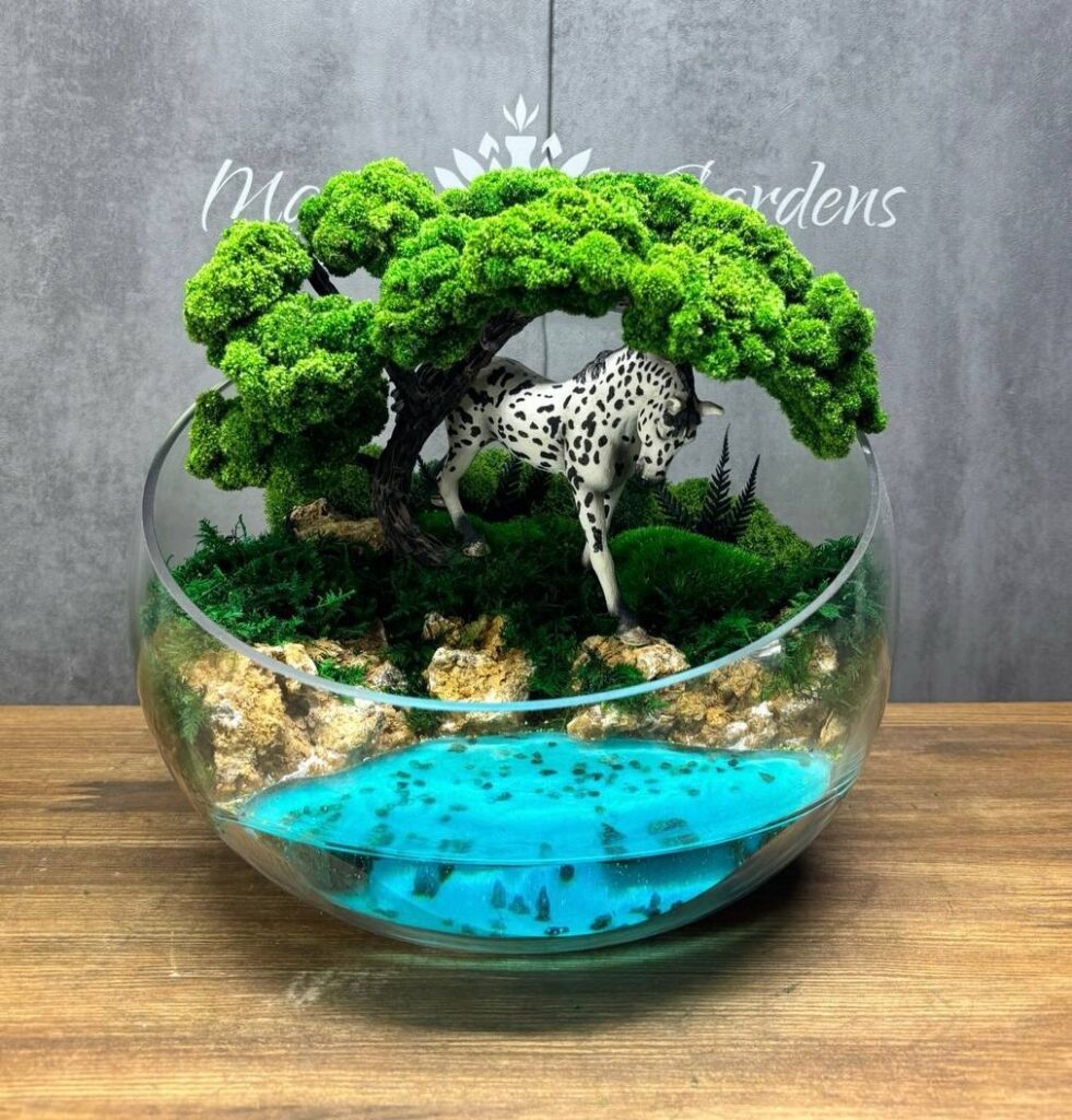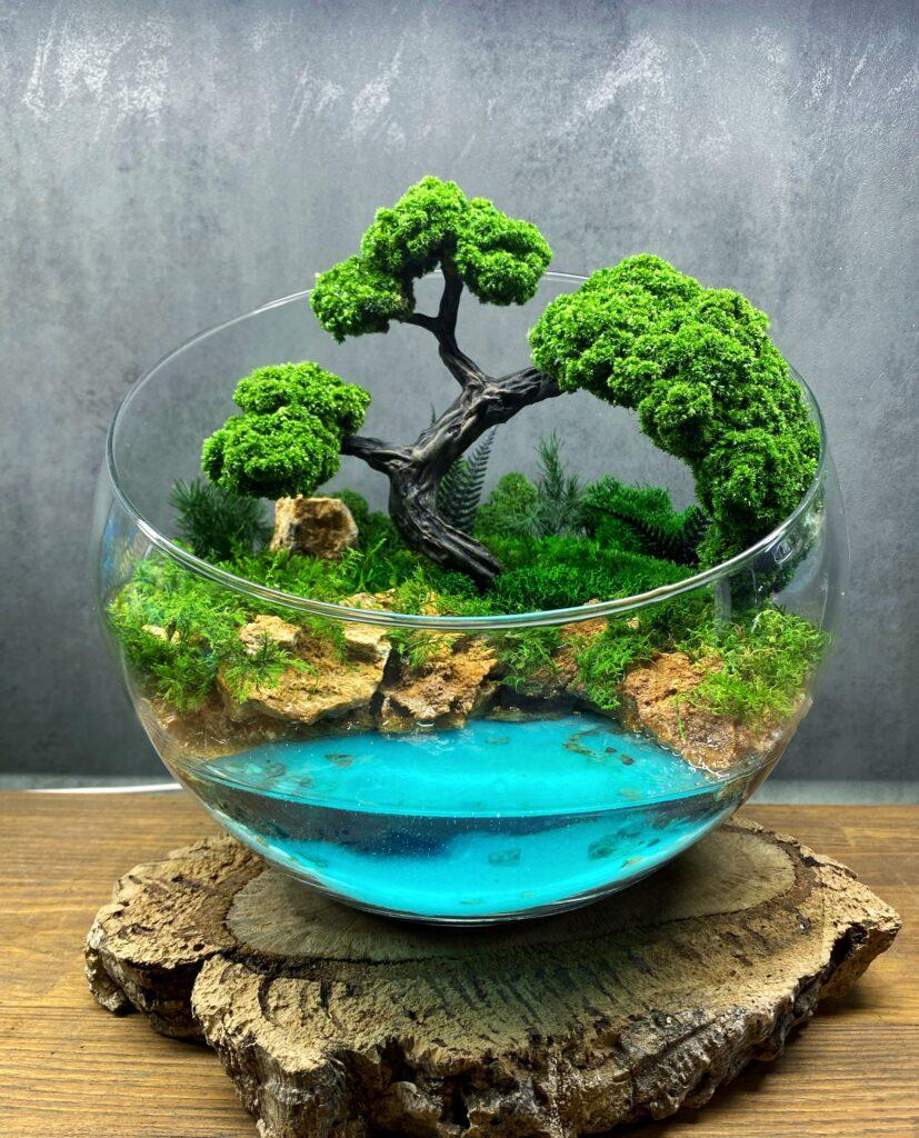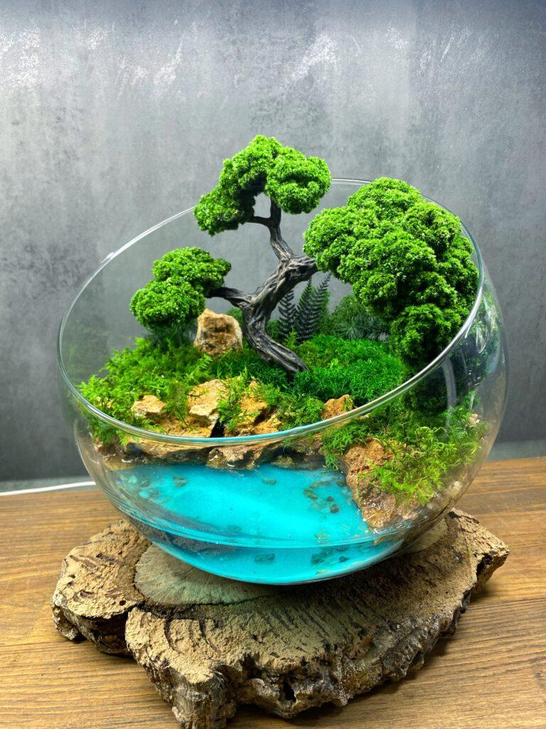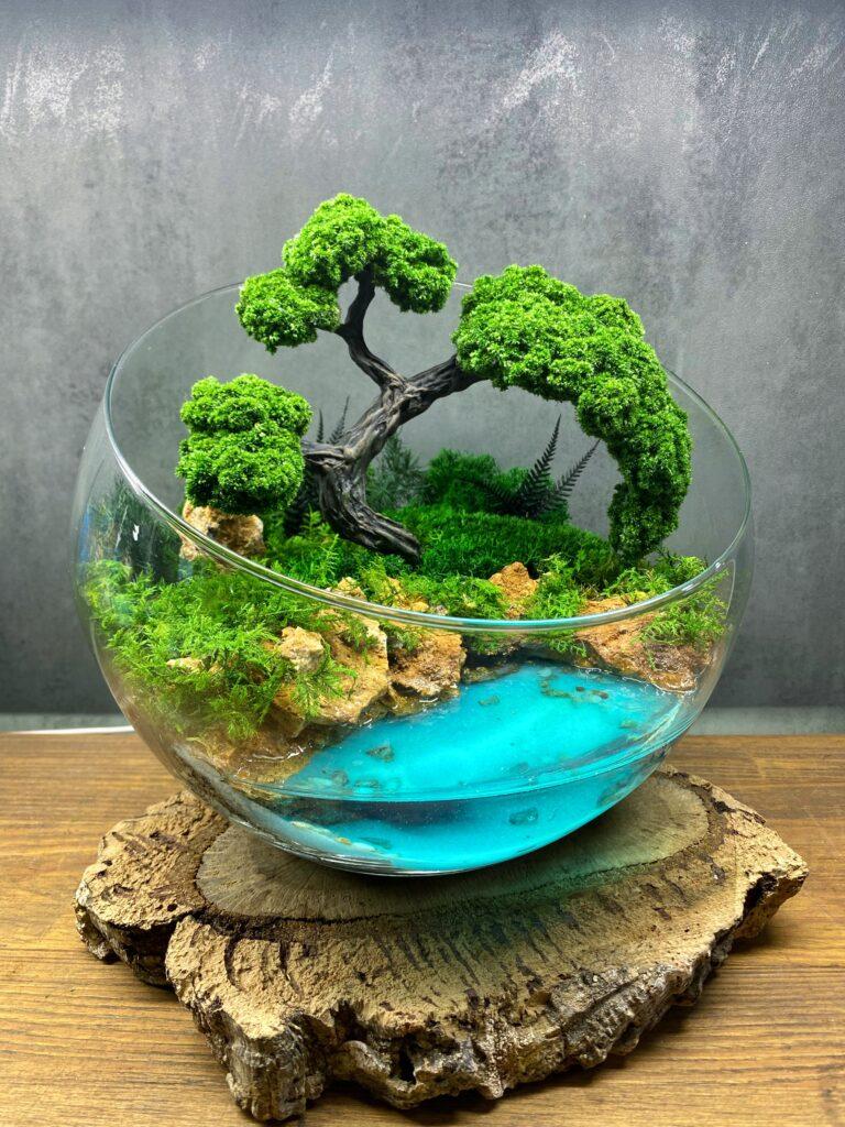 Мосаріум “Рівновага” – це унікальний предмет декору, який поєднує в собі природну красу дерева з елегантністю стабілізованого моху та спокійністю імітації водойми. Кожна деталь цього мосаріуму створена з міркуванням про гармонію та рівновагу у просторі.