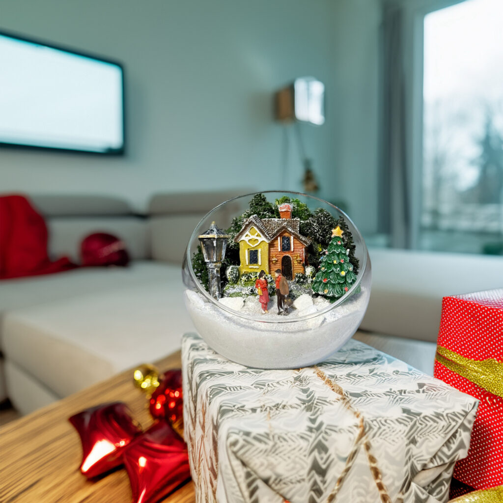 Новорічна композиція у склі з будиночком, ялинкою та закоханою парою створить чарівну атмосферу свята!