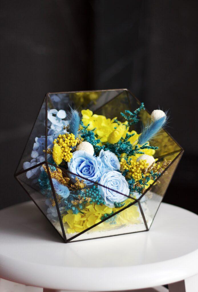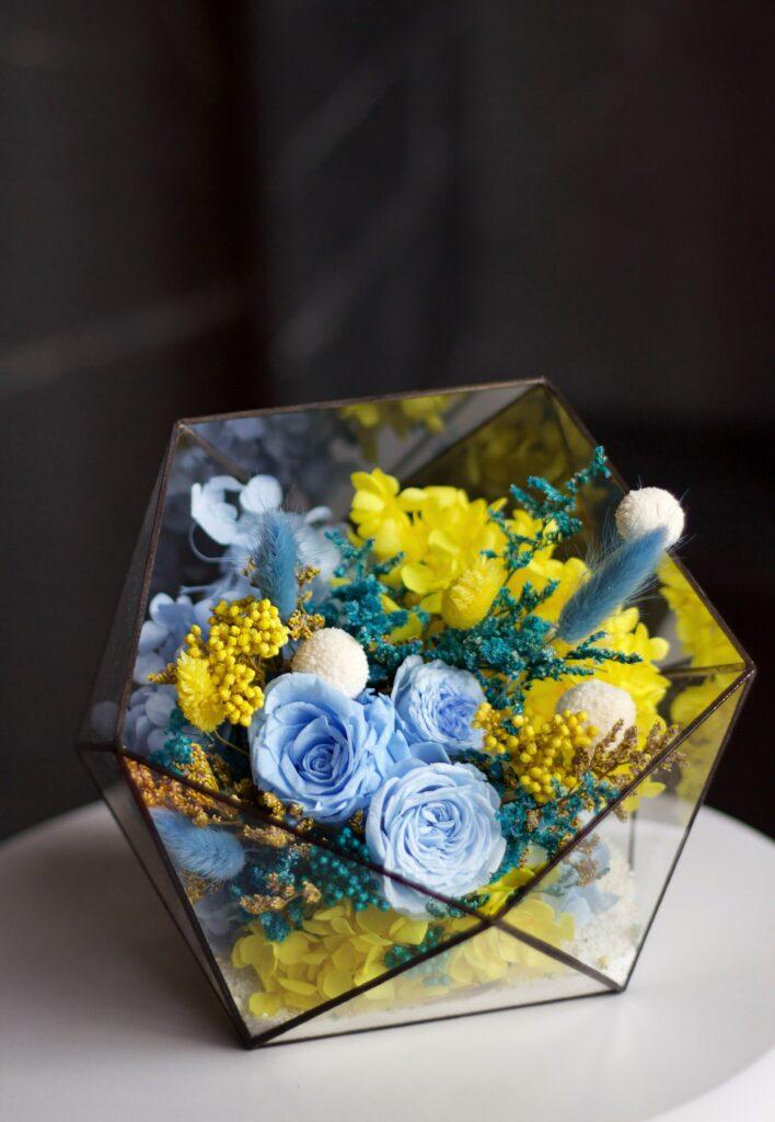 Флораріум “Рідна Україна” – це справжній витвір мистецтва, який поєднує в собі красу природи й любов до рідної країни. Ця композиція зі стабілізованими квітами створює неперевершену атмосферу затишку та гармонії у вашому домі чи офісі. Завдяки використанню стабілізованих рослин, флораріум зберігає свіжість і яскравість без потреби у догляді.