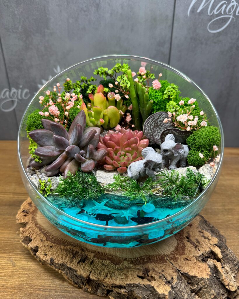 Флораріум із сукулентами та імітацією водойми – це витончена композиція, яка приносить у ваш дім частинку природи. Цей унікальний флораріум є ідеальним подарунком на будь-яке свято: 14 лютого, 8 березня, день народження чи будь-яку іншу урочистість. Створений із ретельно відібраних сукулентів, цей флораріум поєднує красу та витривалість рослин з елегантністю дизайну. Імітація водойми додає композиції реалістичності, створюючи ефект справжнього природного оазису.