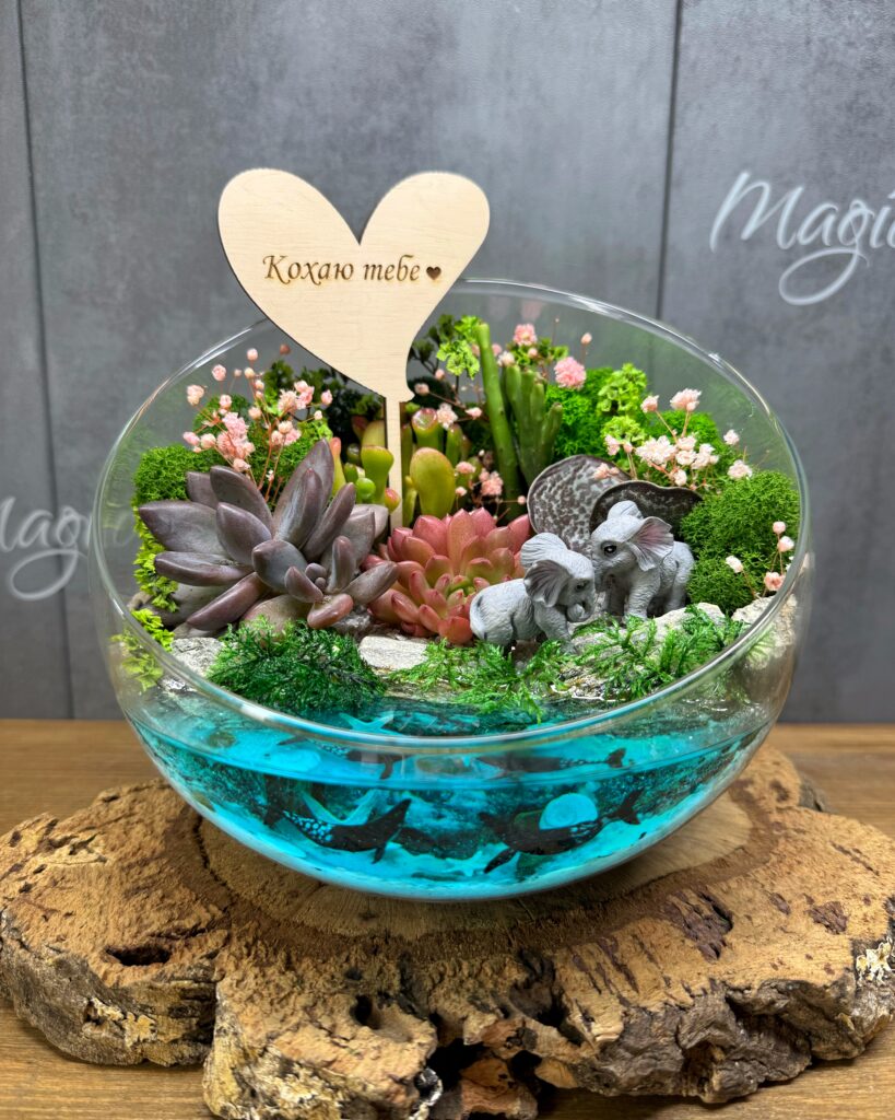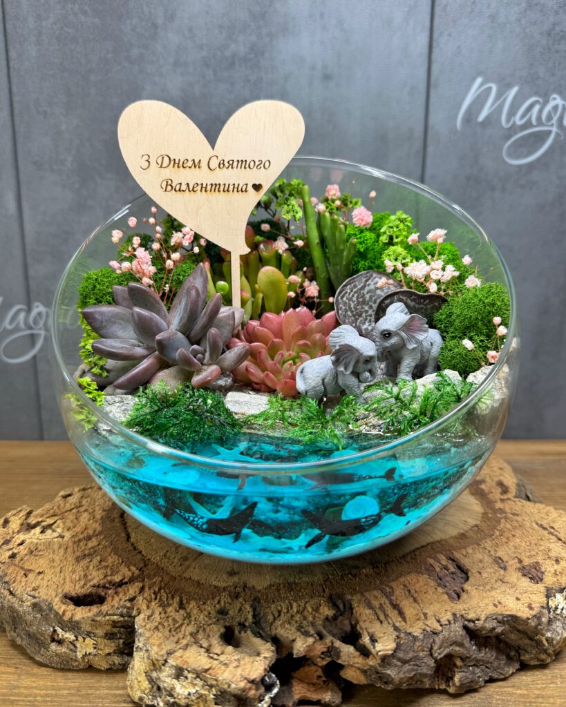 Флораріум із сукулентами та імітацією водойми не лише прикрасить інтер’єр, але й стане символом вашої турботи та уваги. Він підходить для прикрашання як домашнього інтер’єру, так і офісного простору, додаючи нотку спокою та гармонії. Цей флораріум не потребує складного догляду, лише мінімального поливу та захисту від прямих сонячних променів.