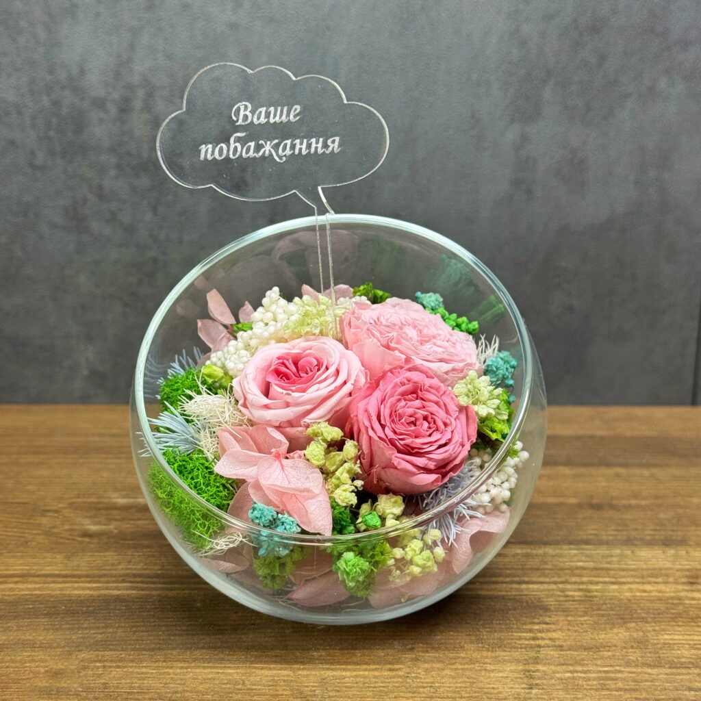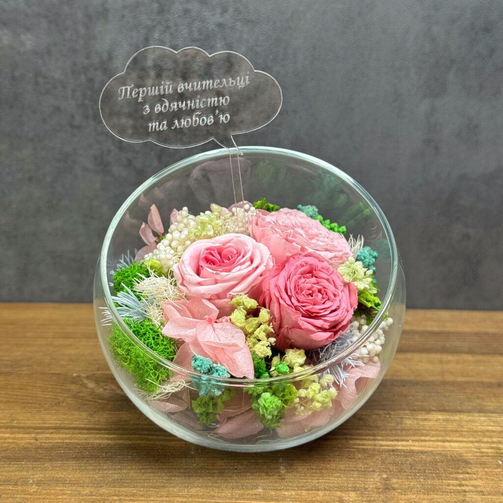 Композиція з ніжних стабілізованих квітів зберігає свою красу роками без догляду. Вона стане чудовим подарунком для вчителя, колеги чи близької людини, а також прикрасить робоче місце чи затишний куточок дому.