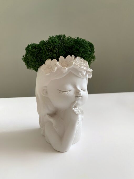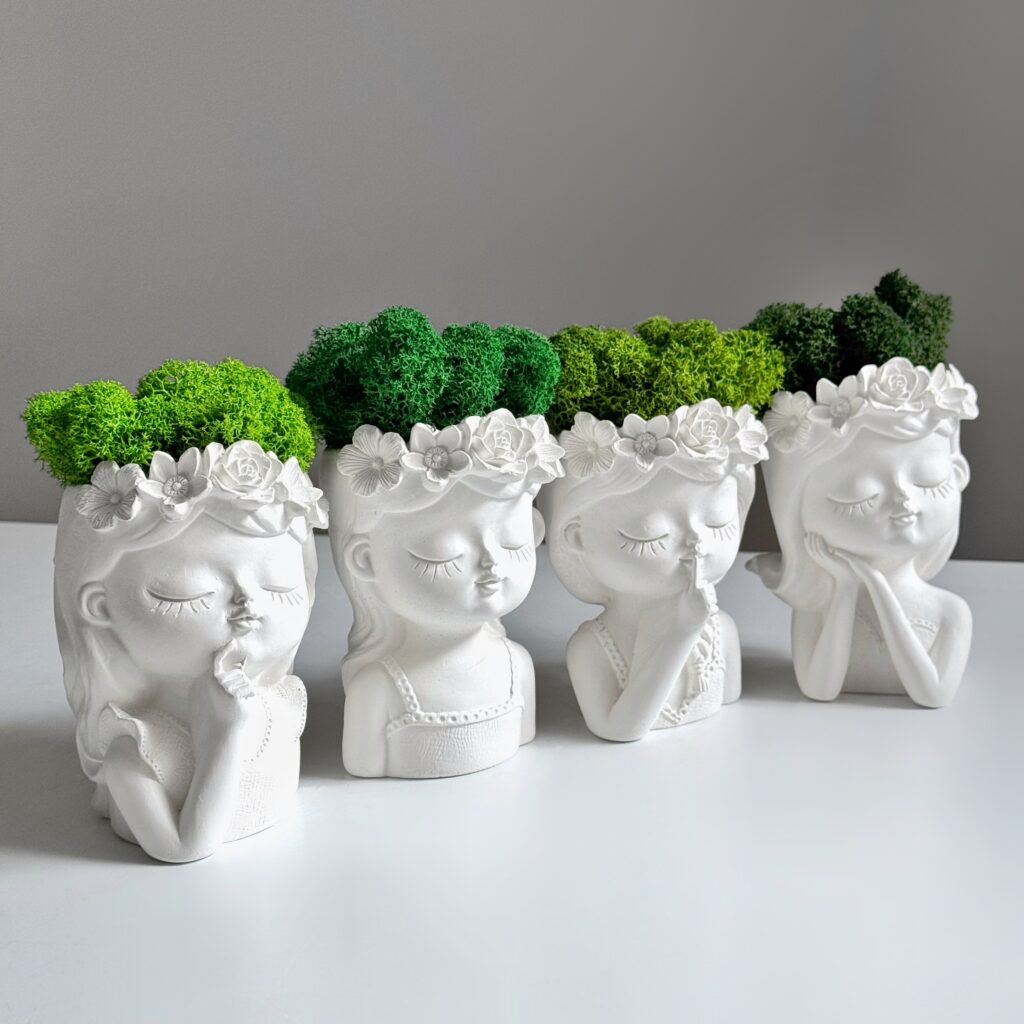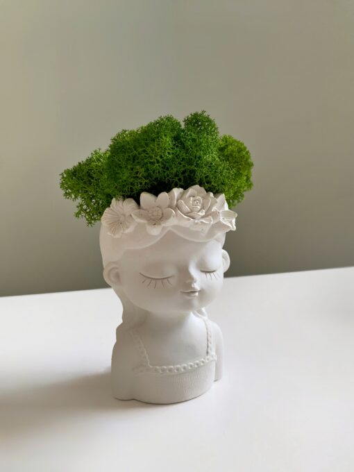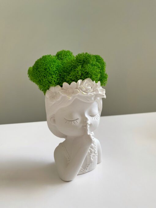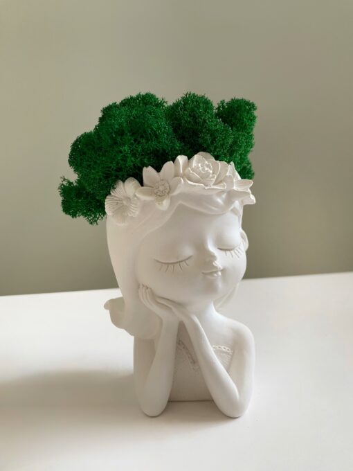 Елегантне кашпо «Дівчина з віночком» з різними відтінками зеленого стабілізованого моху Premium — це витвір мистецтва, що стане яскравим акцентом у будь-якому інтер’єрі. Виготовлене з гіпсу, воно поєднує витонченість скульптури та живу зелень стабілізованого моху, який не потребує догляду, поливу чи сонячного світла. Ви можете обрати бажаний вигляд кашпо (A, B, C, D) та колір моху (1-4), вказавши номер у коментарі до замовлення. Ідеально підходить для дому, офісу або креативного подарунку.