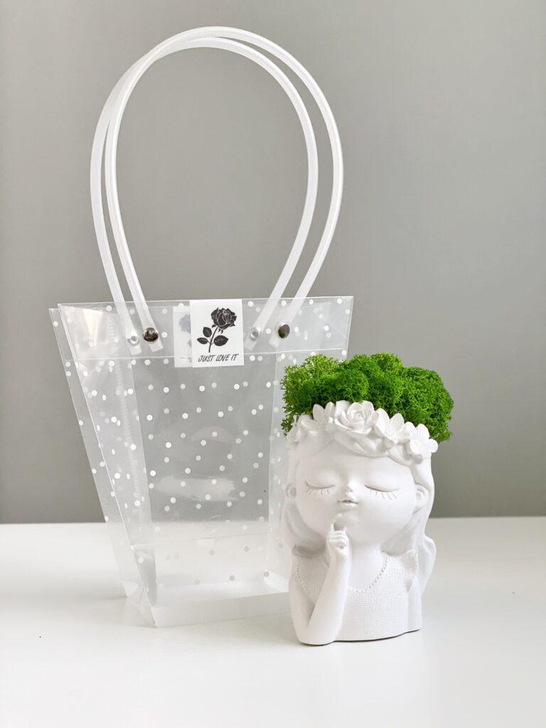 Гарне, акуратне кашпо, пухнастий яскравий мох. Зручно, що є упаковка-сумочка.