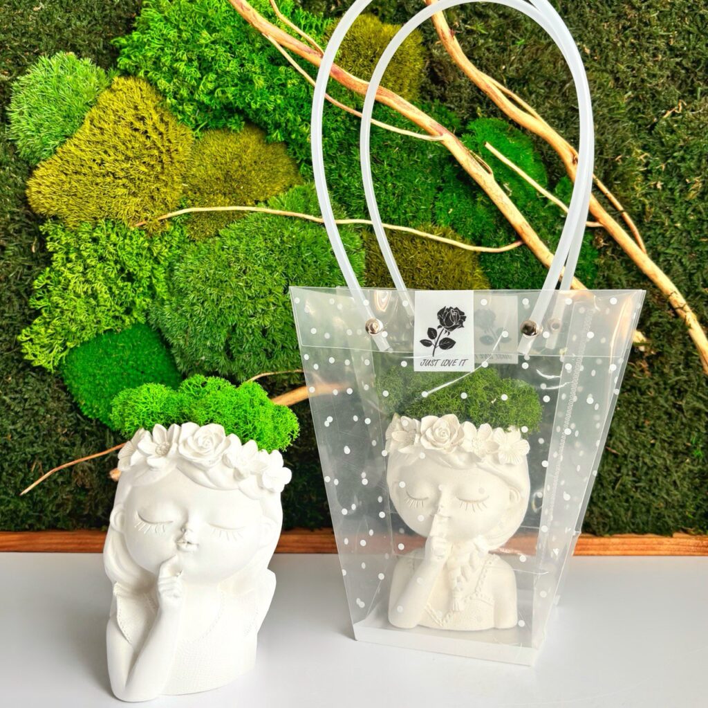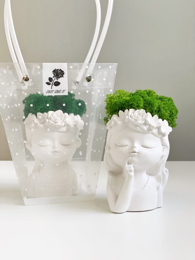 Кашпо Дівчина з віночком з мохом в асортименті та подарунковим пакетом
