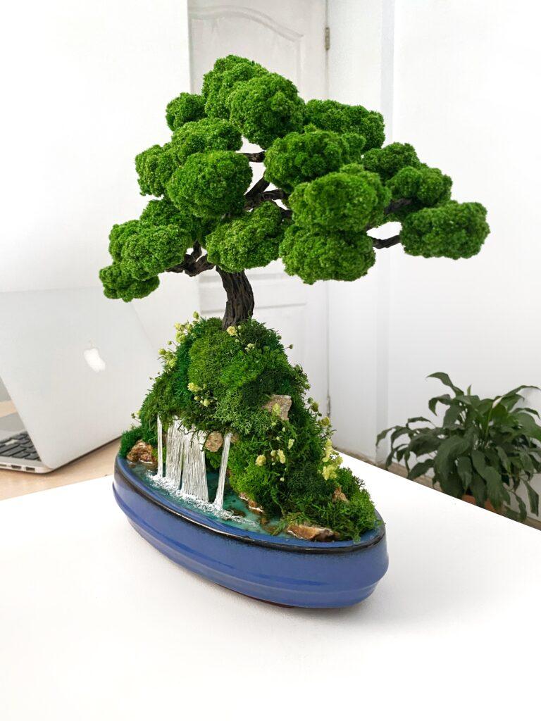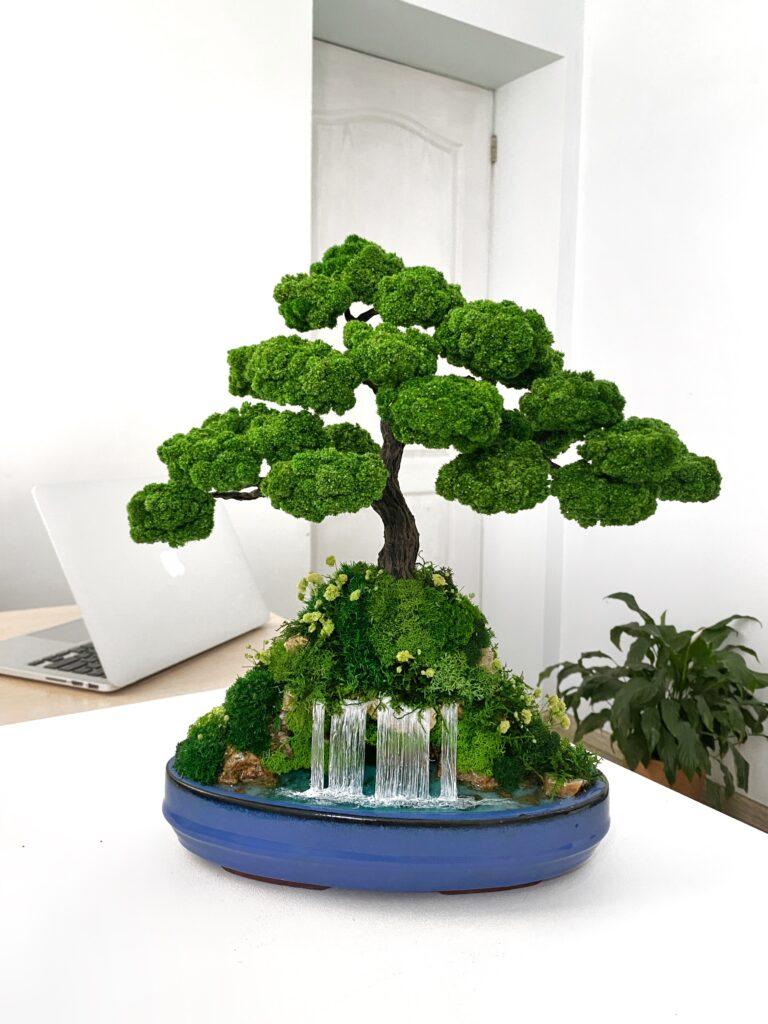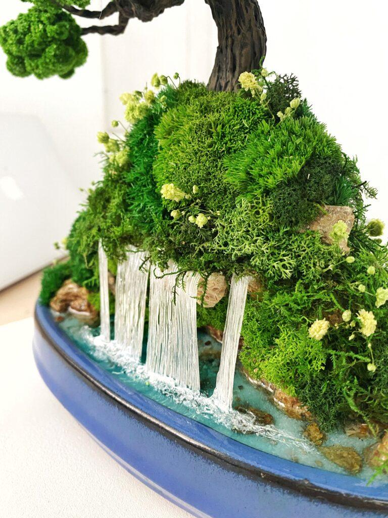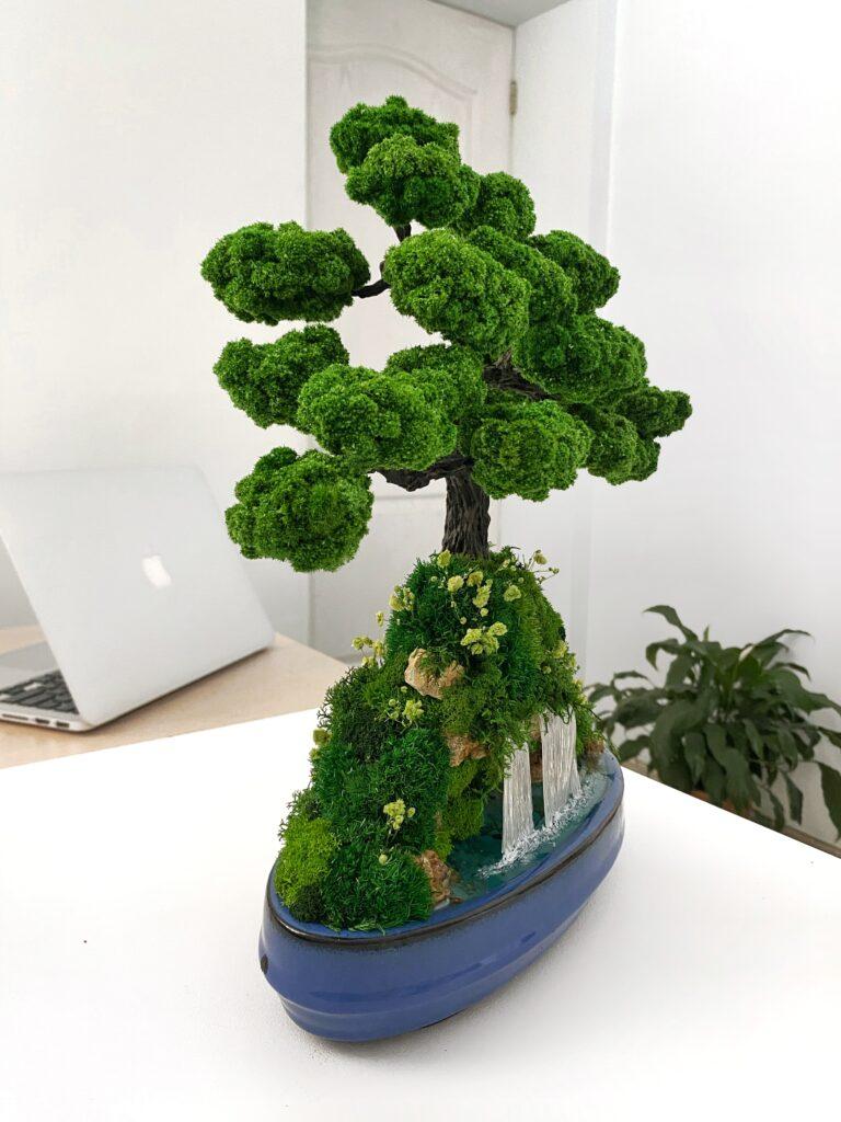 Композиція “Бонсай з водоспадом” — це справжній витвір інтер’єрного мистецтва. Стабілізоване дерево, оточене мохом, квітами й декоративним камінням, вінчає мініатюрний водоспад, що створює ефект живого ландшафту. Виглядає розкішно й оживлює будь-який простір: від дому до офісу, салону чи зони відпочинку. Не потребує догляду, зберігає колір і форму роками. Ефект води підкреслює гармонію та баланс природи просто у вашому інтер’єрі.