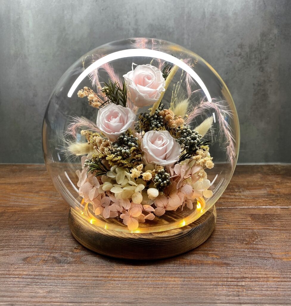 Ця композиція зачаровує грою відтінків і текстур, створюючи відчуття магії. Найтонші пелюстки троянд, легкі трави та переливчасті намистинки переплітаються у гармонійну квіткову картину, що дарує тепло та затишок. Вечірнє світло підкреслює глибину фарб, створюючи атмосферу ніжності та спокою. Ідеальний подарунок для тих, хто цінує естетику та природну красу.