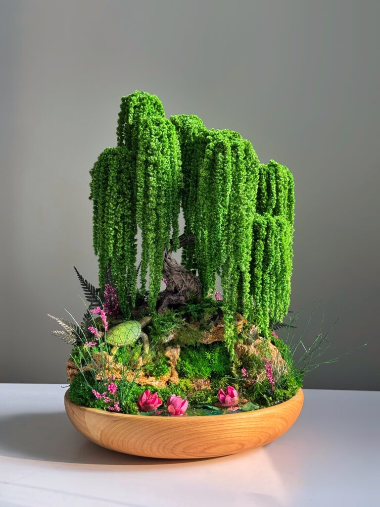 Чарівна композиція «Подих казкового лісу» — це справжній витвір мистецтва, що занурює у магічну атмосферу природи. У центрі — велике стабілізоване дерево з ефектом плакучої крони, оточене соковитою зеленню, ніжними квітами та маленьким водоймищем з лататтям. Атмосферу доповнює декоративна черепашка, яка надає композиції казкової живості.
