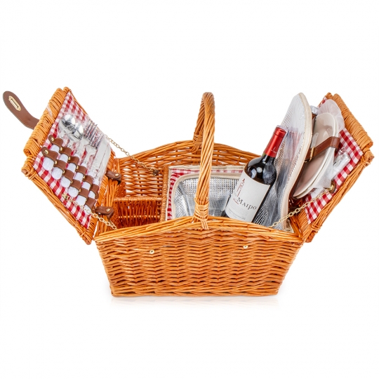 Плетений кошик для пікніка – ідеальний подарунок для справжніх естетів, любителів відпочити на природі. Кошик виглядає дуже естетично і стильно, він додасть атмосфери вуличній прогулянці. Кошик виготовлений з лози, всередині має смугасту підкладку з натурального матеріалу. Набір розрахований на 2 персони.