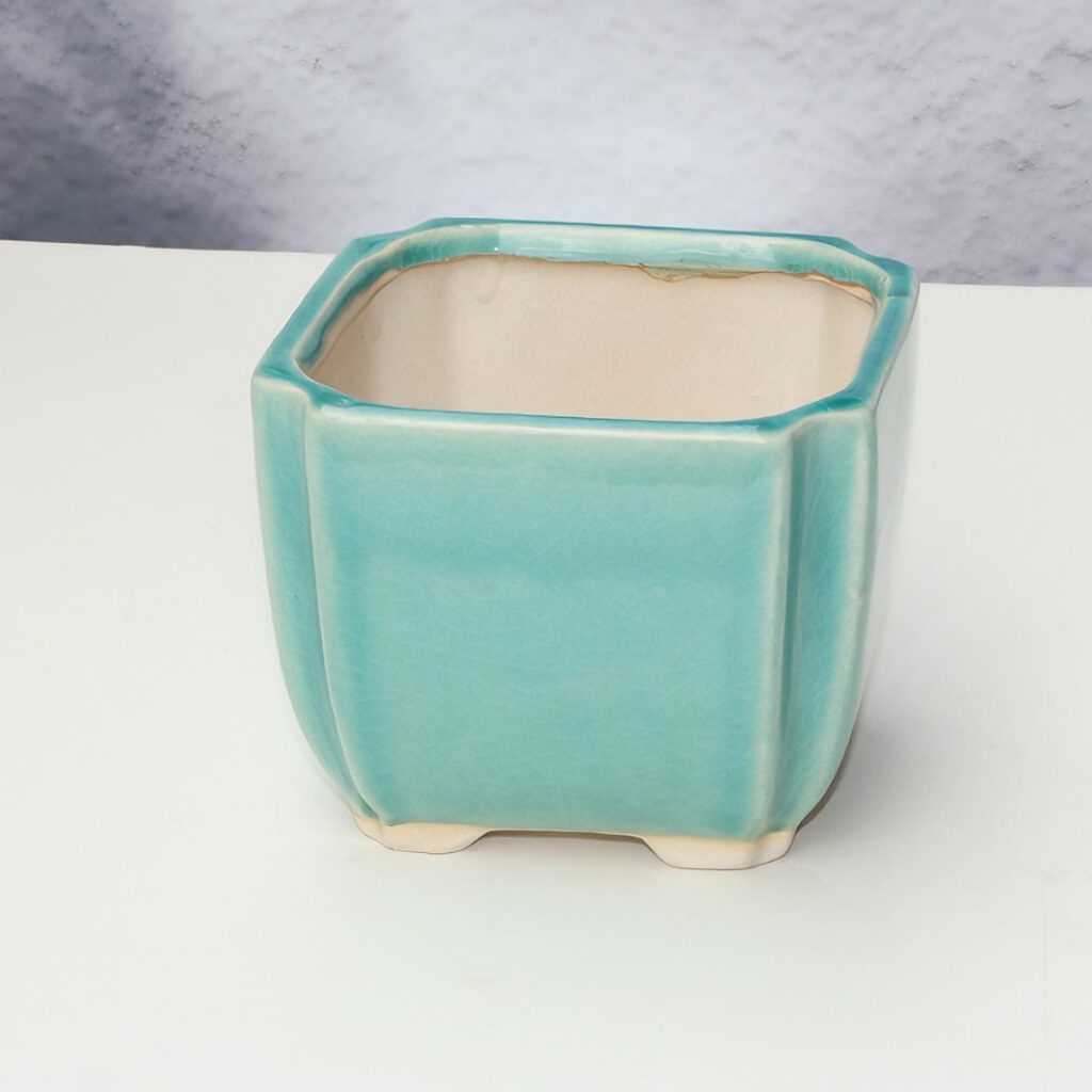 Пориньте у спокій ранкової бірюзової тиші. Бонсайниця виконана в ніжному аквамариновому кольорі з плавним переходом відтінків – як відображення першого світла на водній гладі. Прямокутна форма з м’якими вигинами надає композиції відчуття стійкості та гармонії. Ідеальна для мініатюрних дерев і сукулентів.