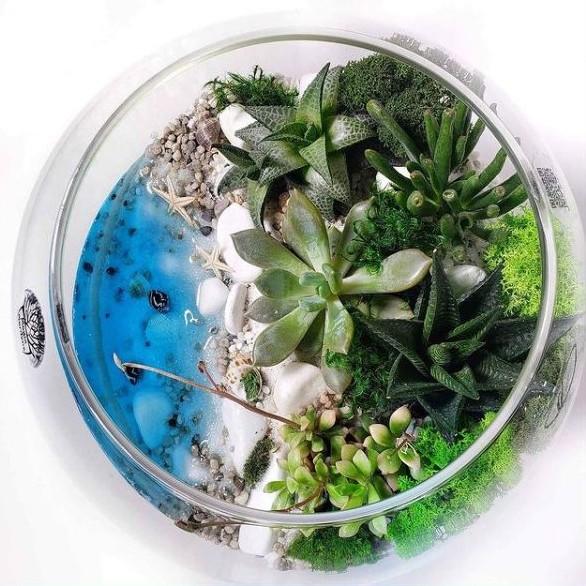Третя колонка – все те саме, тільки з імітацією водойми. Його ми можемо підготувати заздалегідь (тоді ви забираєте флораріум одразу після майстер-класу) або залити після майстер-класу (забираєте флораріум за кілька днів).