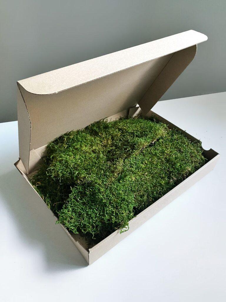 Стабілізований плоский мох — це екологічно чистий матеріал, який зберігає свою природну красу та м’якість завдяки спеціальній обробці. Упаковка вагою 0,5 кг підходить для декорування невеликих поверхонь або створення акцентних елементів в інтер’єрі.