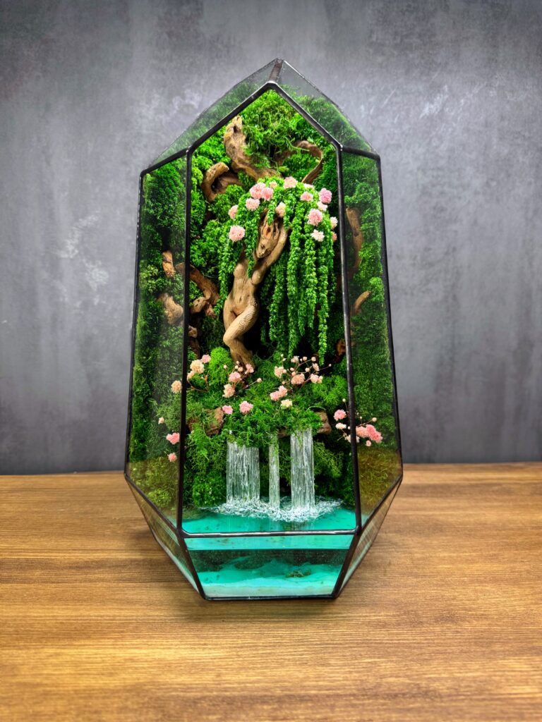 Мосаріум не потребує догляду – стабілізований мох зберігає свою свіжість роками, а мініатюрні деталі залишаються незмінними. Підходить для дому, офісу, студії, а також стане вишуканим подарунком для цінителів унікального декору.