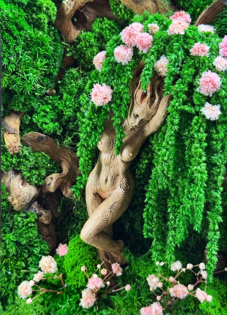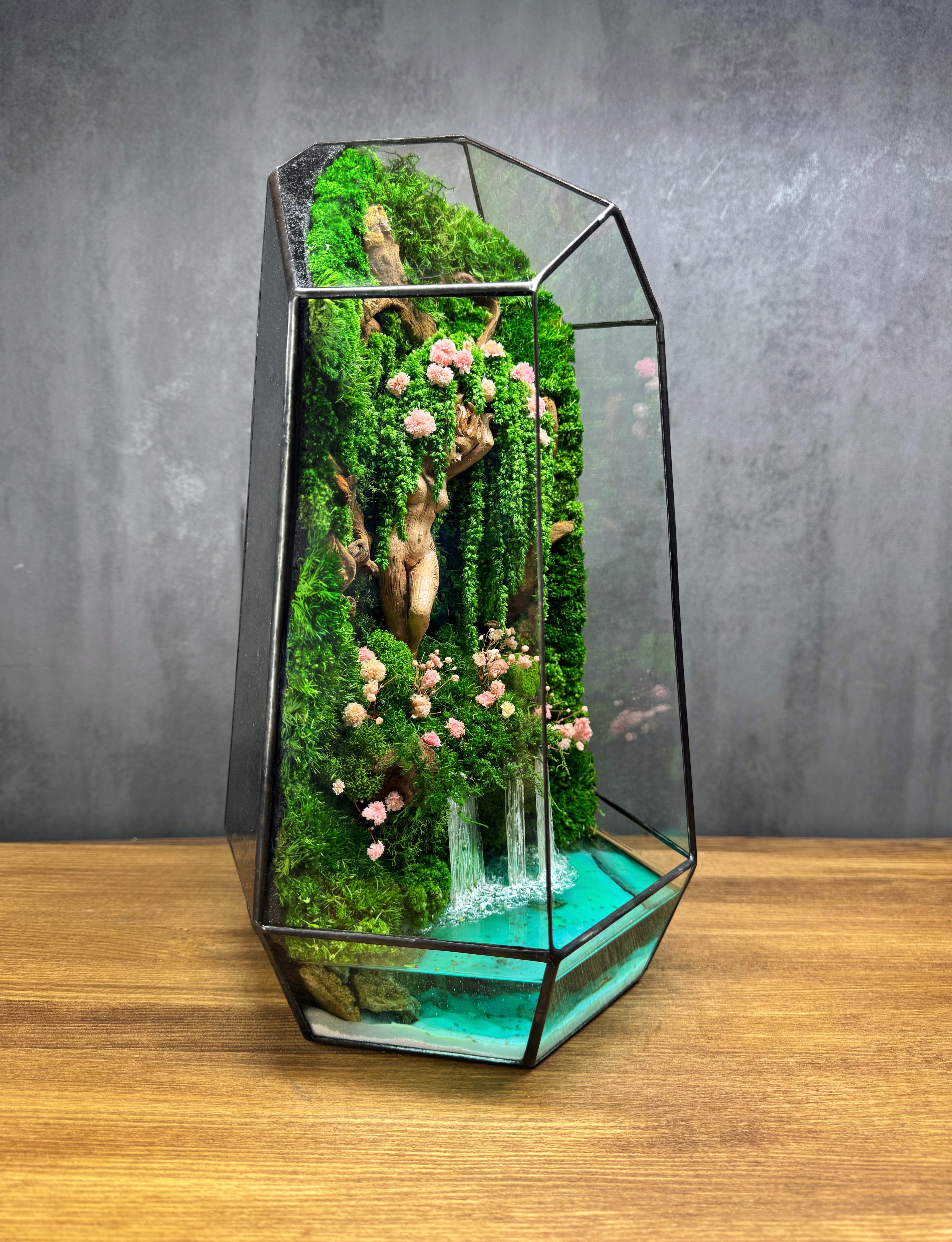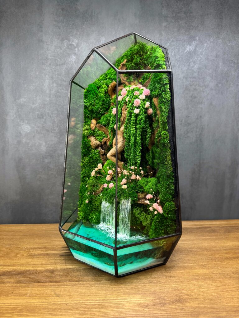 Мосаріум «Богиня лісу» – це чарівна композиція, створена для тих, хто цінує природу, мистецтво і казкову атмосферу в інтер’єрі. У центрі цієї унікальної композиції знаходиться дівчина з дерева, втілення лісового духу, що бережно зберігає силу природи. Звисаючі гілки, вкриті стабілізованим мохом і квітами, створюють ефект загадкового чарівного лісу, а штучний водоспад додає динаміки та відчуття живої природи.