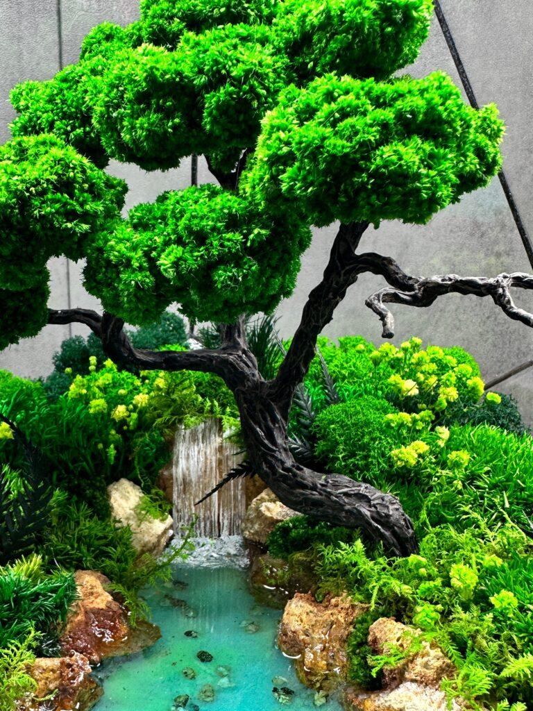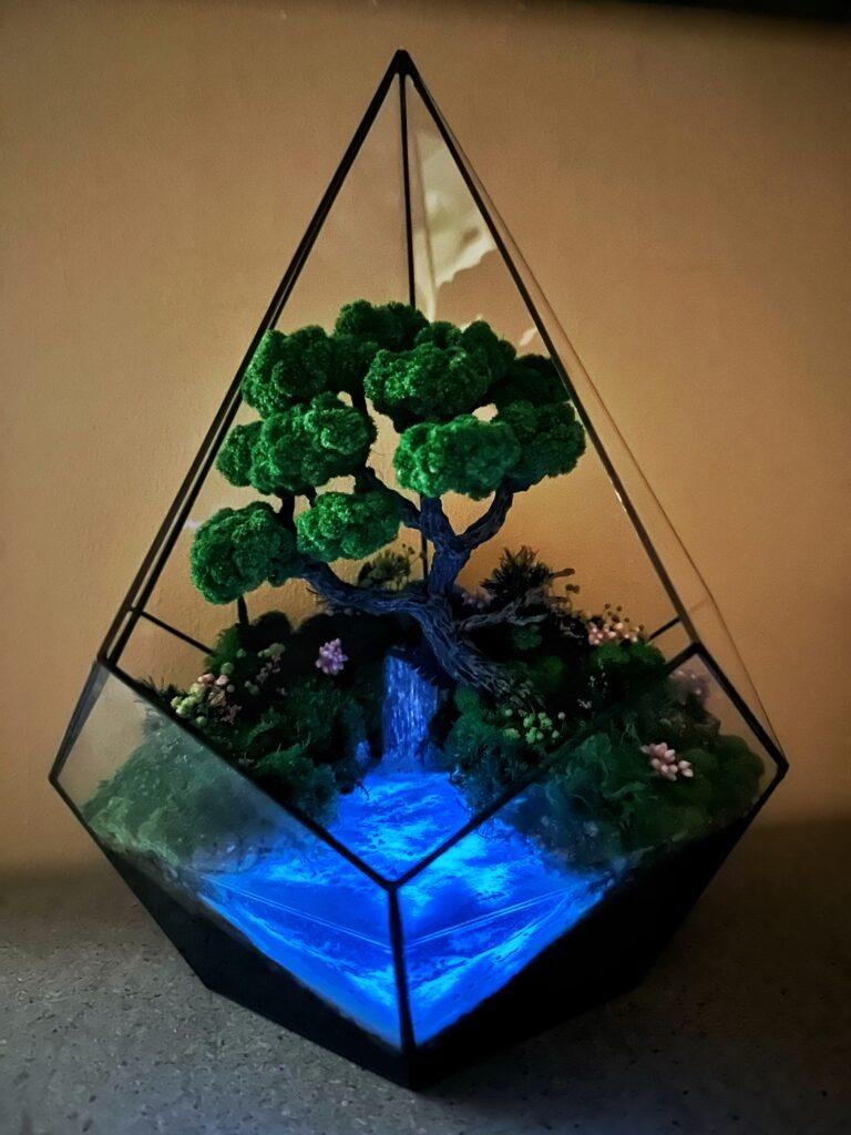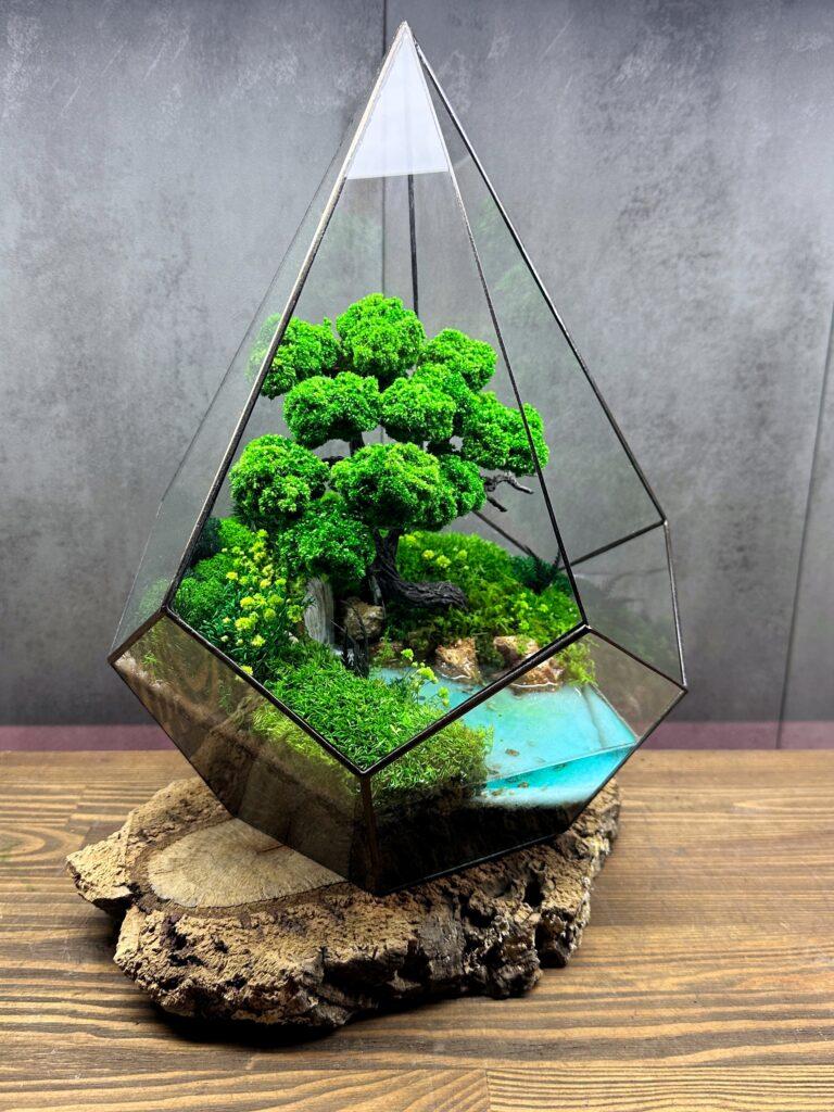 Мосаріум виготовлений зі стабілізованих рослин. Не вимагає догляду, поливу та сонячного світла.