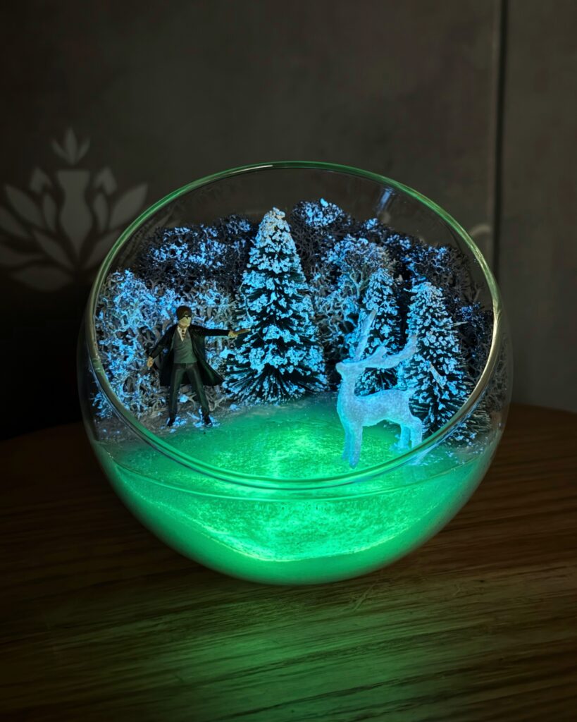Головна особливість — сяюча водойма, яка накопичує світло вдень або від лампи, а в темряві світиться яскравим чарівним відблиском. Ефект світіння створює справжнє відчуття магії, ніби сцена оживає після заходу сонця.
