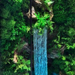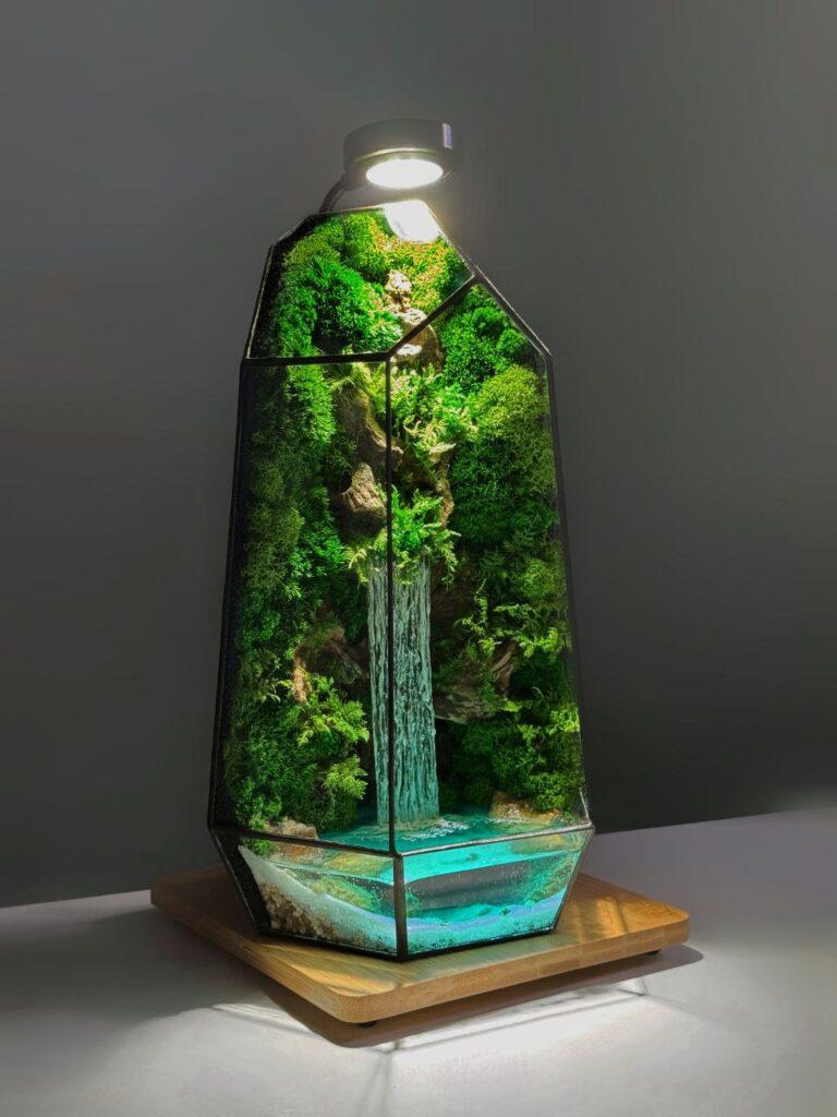 Завдяки світлодіодній лампі потужністю 5W, водоспад світиться в темряві та напівтемряві, створюючи чарівну атмосферу. Мосаріум виготовлений з високоякісного скла та наповнений стабілізованим мохом, що дозволяє йому зберігати свіжість без догляду. Цей декоративний елемент стане ідеальною прикрасою інтер’єру або оригінальним подарунком для любителів природи та мінімалізму.