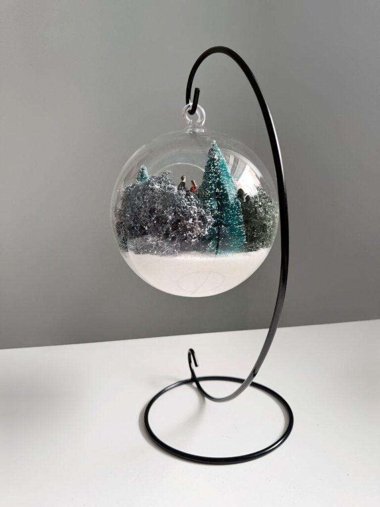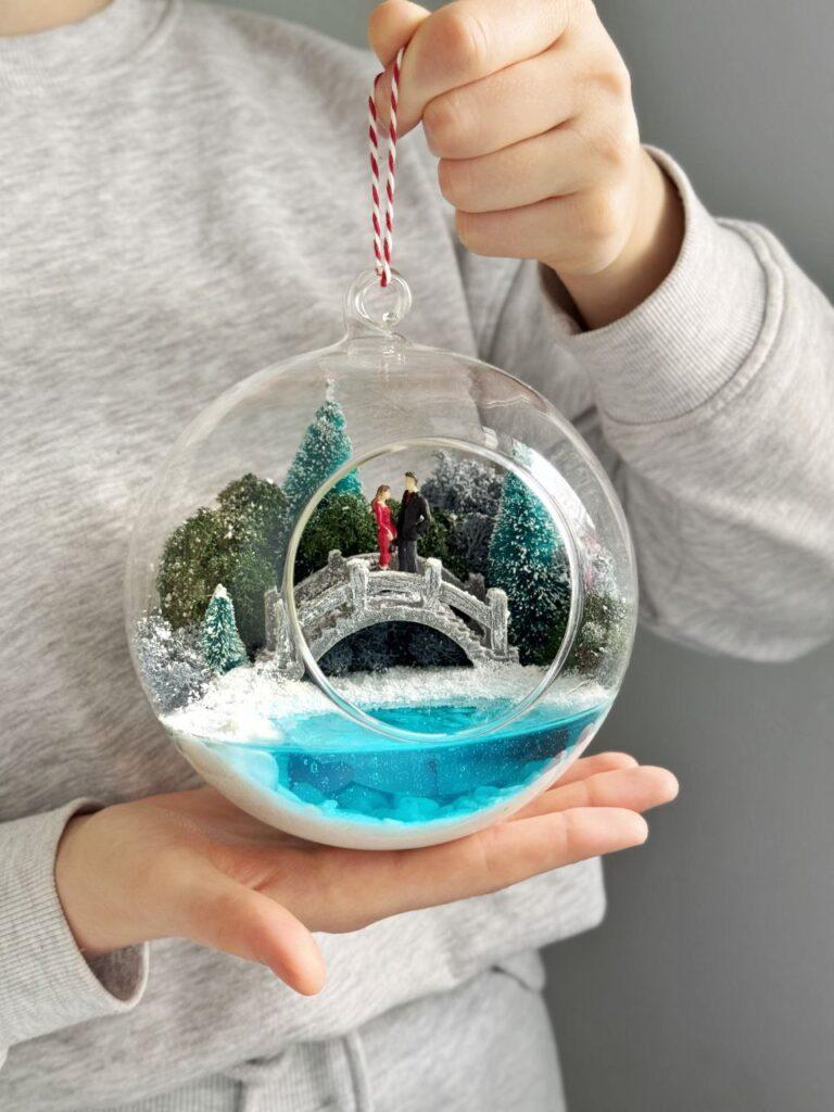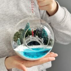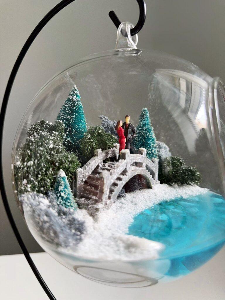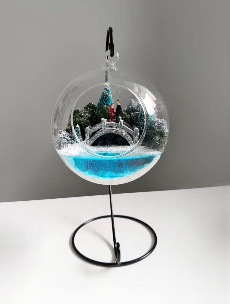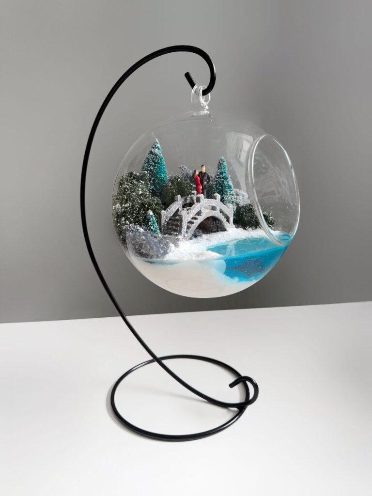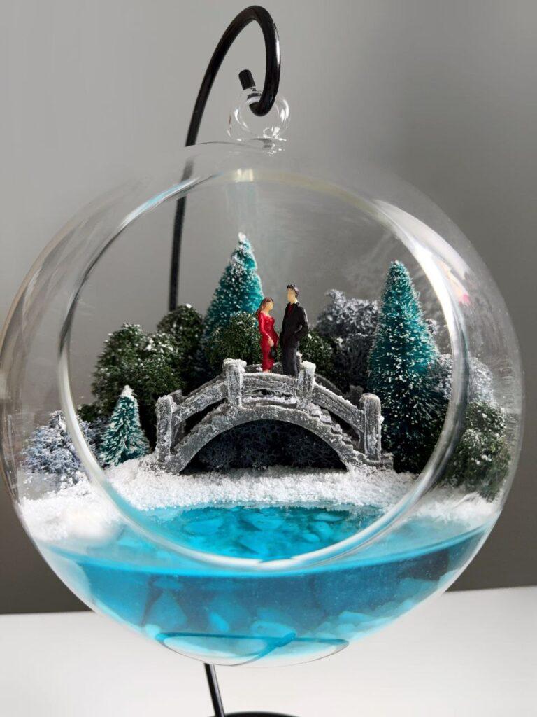 Витончений мосаріум у формі прозорої кулі з вишуканим дизайном стане ідеальним акцентом для вашого інтер’єру. Усередині кулі знаходиться мініатюрна композиція: засніжені дерева, романтичний місток та пара закоханих, занурених у зимову казку. Особливістю мосаріуму є імітація водойми, яка світиться в темряві та напівтемряві, створюючи чарівну атмосферу затишку та магії.