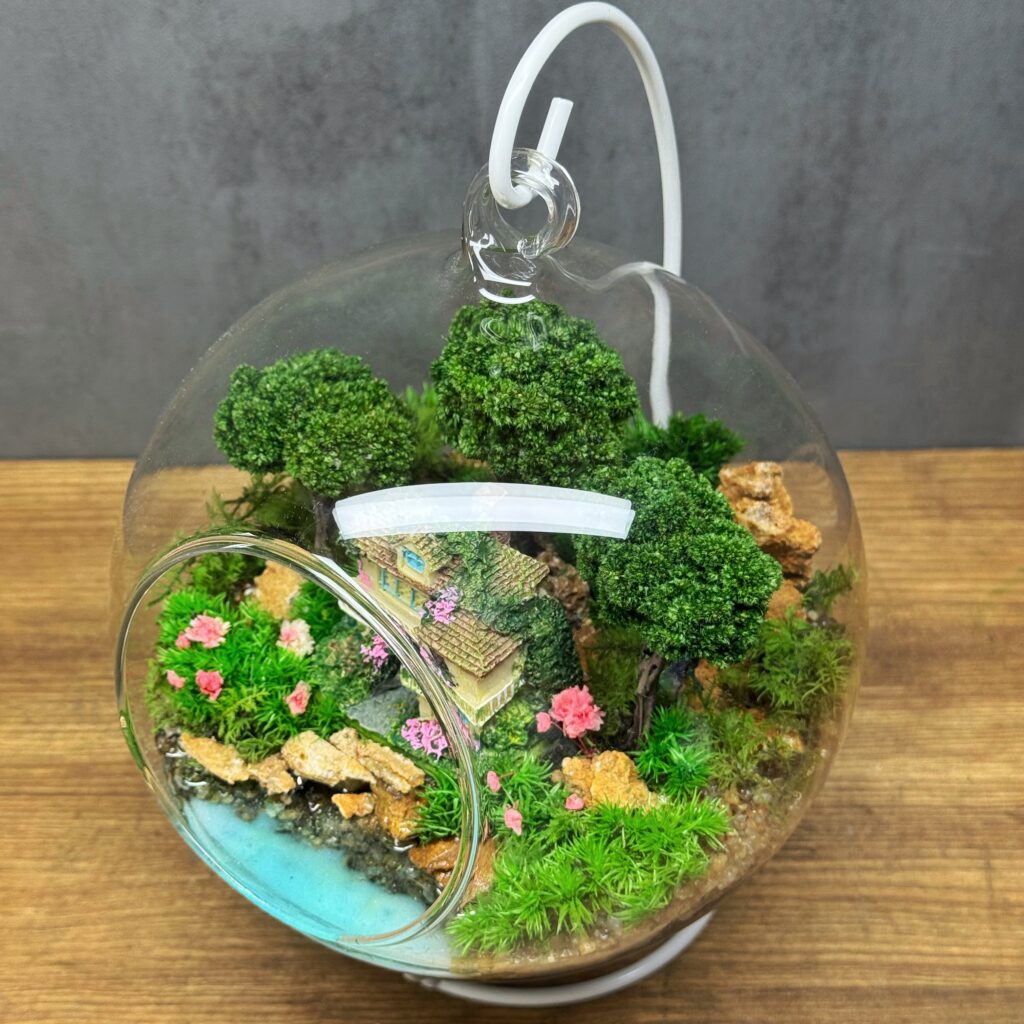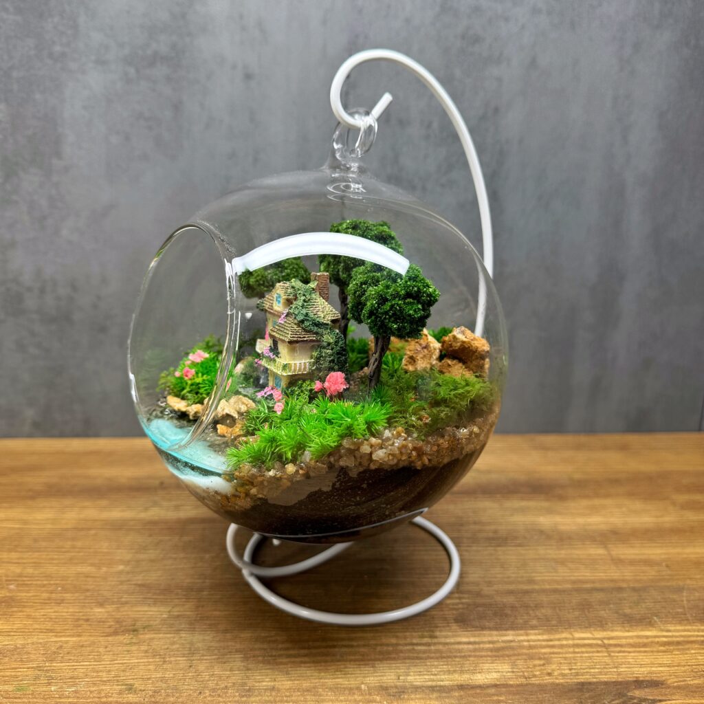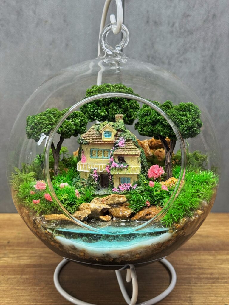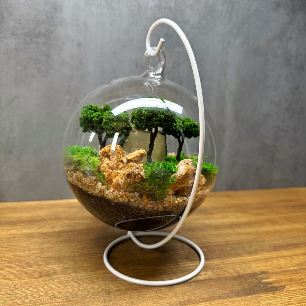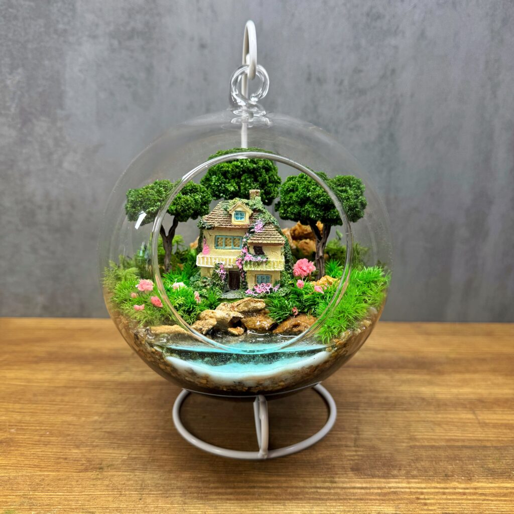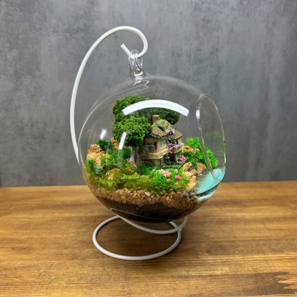 Мініатюрний світ усередині скляної сфери притягує погляд і створює атмосферу затишку та спокою. Композиція в підвісній кулі оформлена стабілізованими деревами, мохом, квітами та декоративним будиночком, що стоїть біля струмка і світиться в темряві та напівтемряві. Ручна робота забезпечує неповторність кожної деталі. Мосаріум не потребує догляду і збереже свою красу на довгі роки, ставши стильним акцентом в інтер’єрі.