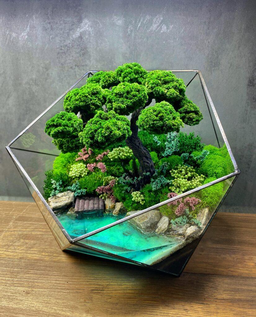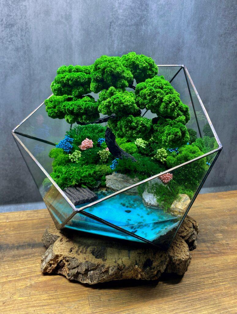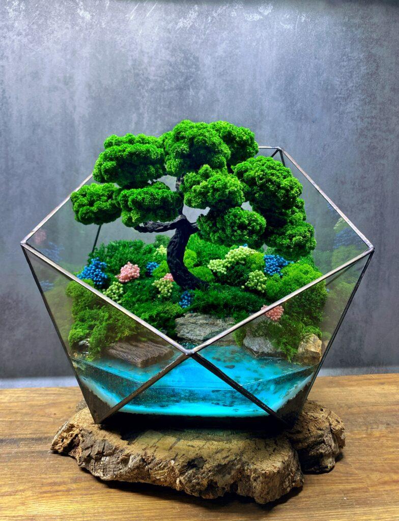 Мосаріум “Затишок” – це маленький світ у мініатюрі, де ви можете насолоджуватися красою природи прямо вдома або в офісі. Дерево всередині мосаріуму дарує відчуття стабільності та мудрості, а імітація води додає відчуття прохолоди та свіжості.