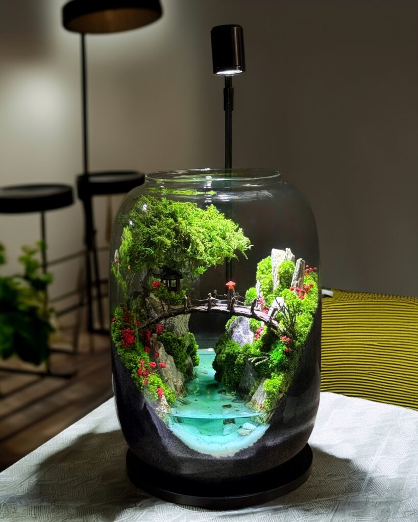 Підсвічування м’яко освітлює композицію в темряві, створюючи атмосферу затишку та магії. Такий мосаріум стане центром уваги в інтер’єрі, офісі або стане особливим елементом подарунка для поціновувачів природи та гармонії.