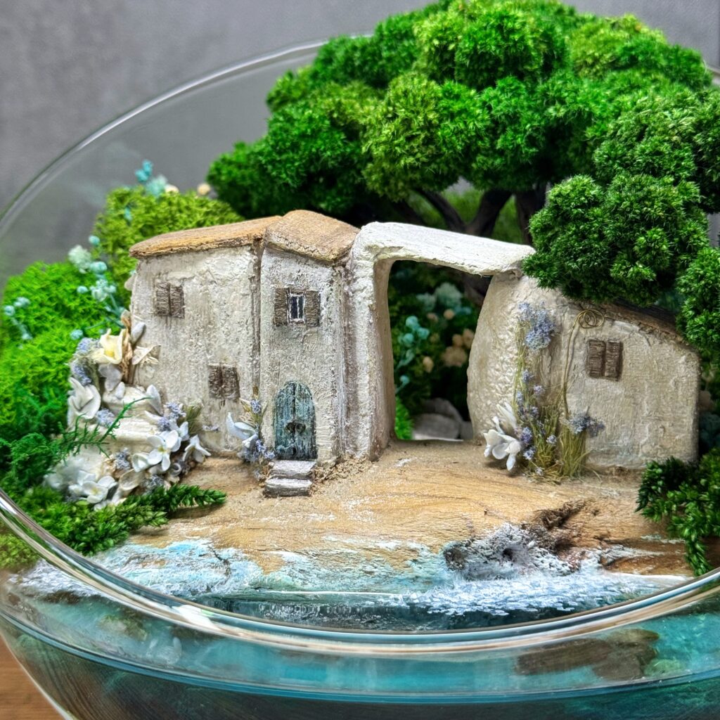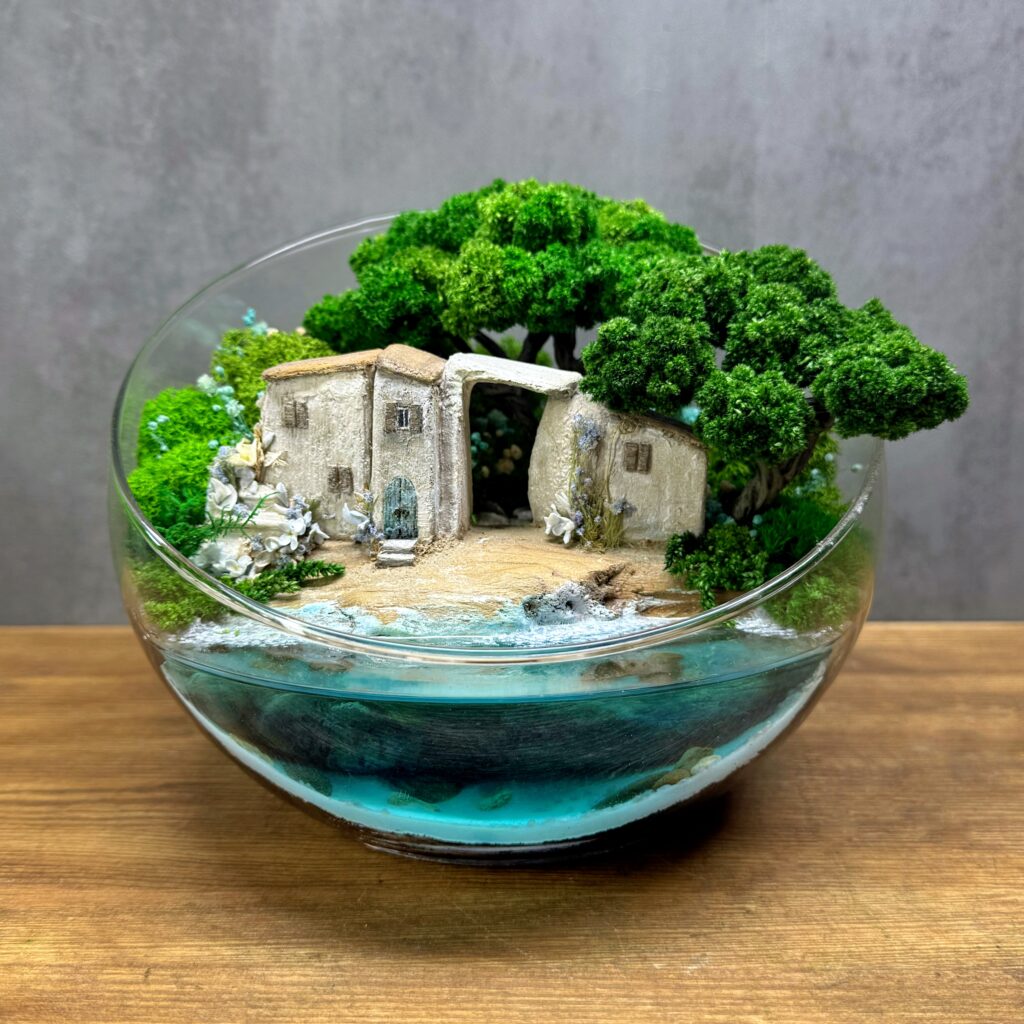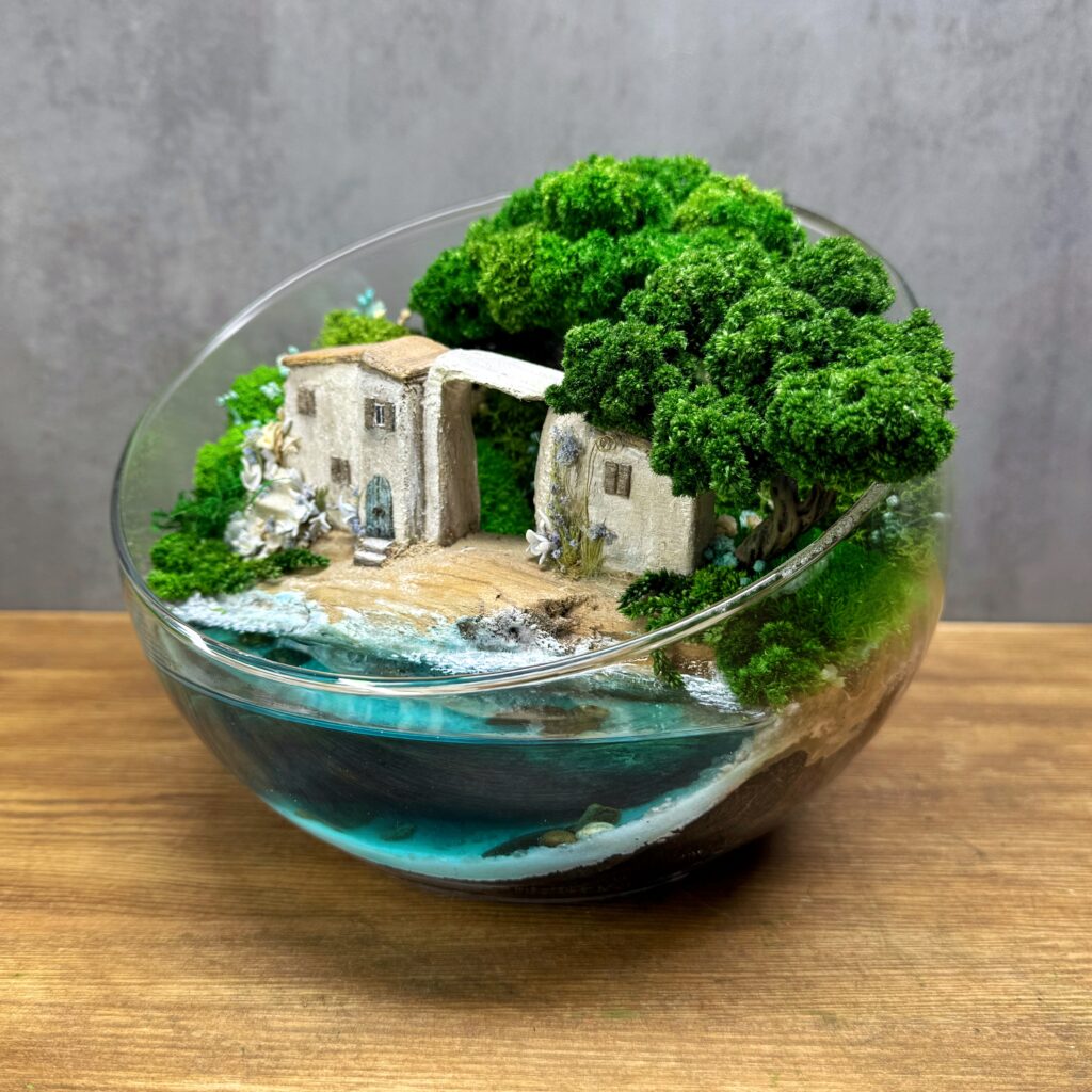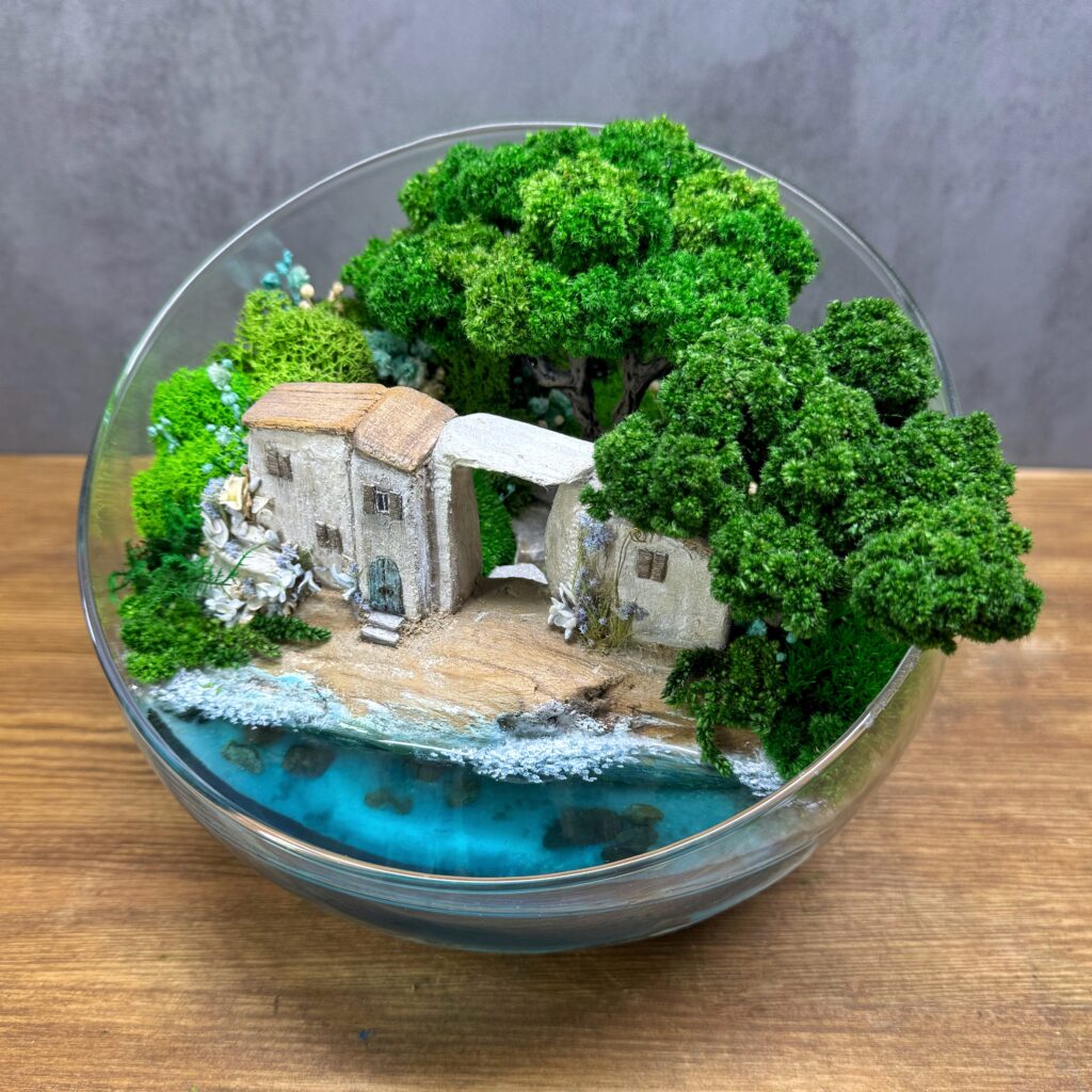 Цей мосаріум – не просто декор, а цінний художній об’єкт, створений вручну в єдиному екземплярі. Усередині скляної сфери – відокремлений прибережний будиночок, біля порога якого хлюпається прозора вода. Над ним нависають дерева зі стабілізованого моху, які не потребують догляду і зберігають свій вигляд довгі роки. Кожен елемент – від крихітних дверей до найдрібніших квітів біля стін – створений вручну, з любов’ю та увагою до деталей.