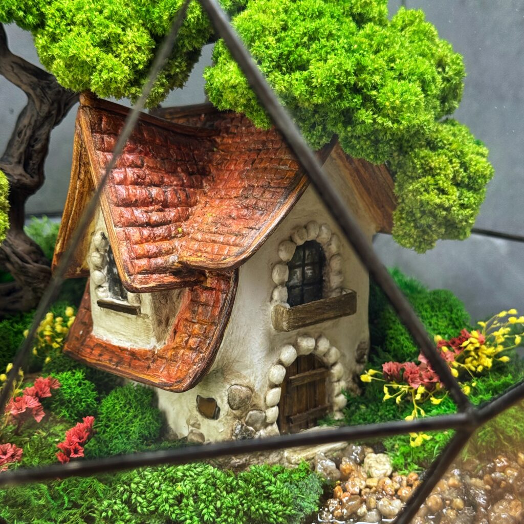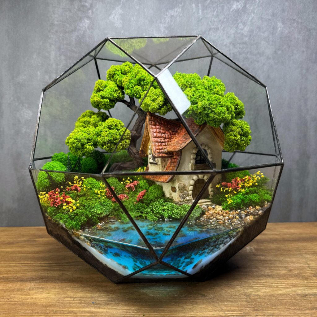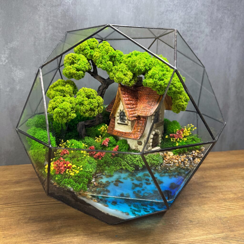 Цей мосаріум — це ручна казка у геометричному скляному куполі. У центрі – унікальний авторський будиночок із черепичним дахом, оточений соковитим стабілізованим мохом, реалістичними деревами та яскравими квітами. Імітація прозорої водойми з камінцями доповнює сцену, створюючи ілюзію справжньої природи. Композиція дарує відчуття затишку, гармонії та спокою. Ідеальне рішення для прикраси дому, офісу або як оригінальний подарунок. Мосаріум не потребує догляду, довговічний і унікальний — кожен створюється вручну, тому кожен екземпляр унікальний.