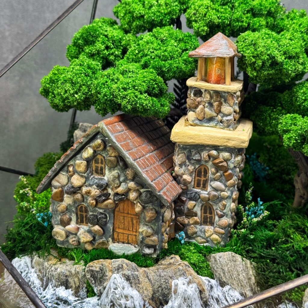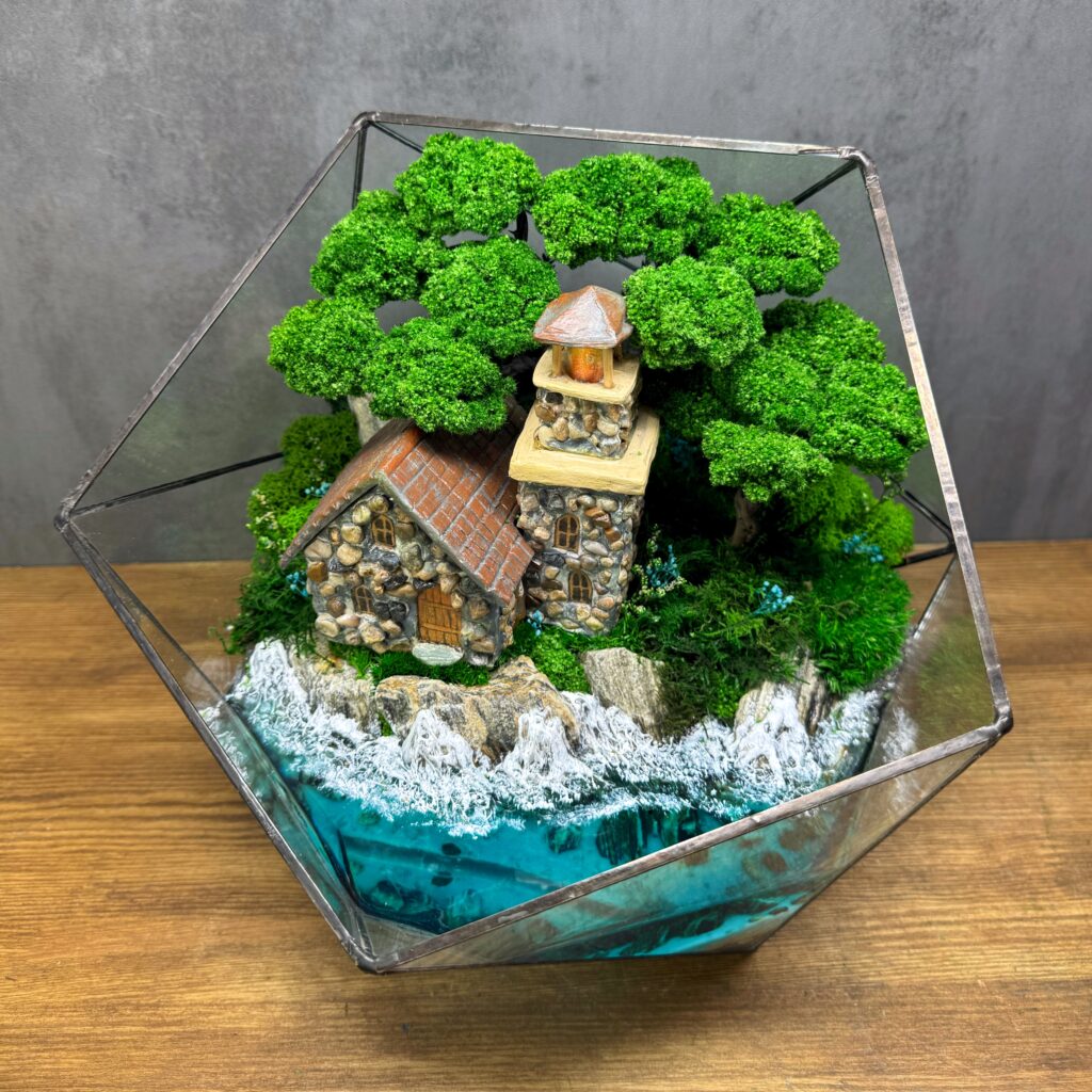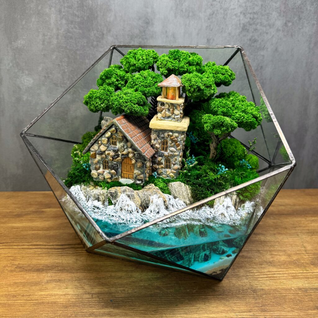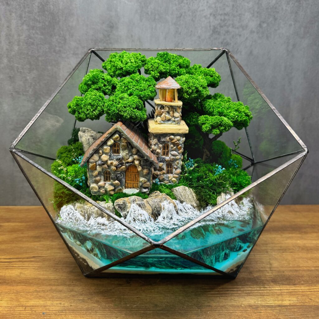 Цей мосаріум створений вручну з неймовірною деталізацією, що переносить у фантастичну лісову казку. Всередині — дизайнерський кам’яний будиночок з маяком, оточений зеленими деревами з натурального стабілізованого моху. Нижня частина композиції прикрашена реалістичною імітацією водоспаду, який світиться в темряві. Унікальний скляний контейнер геометричної форми створює ефект глибини та простору. Кожен елемент виготовлений вручну, ідеальний подарунок і декор для інтер’єру.