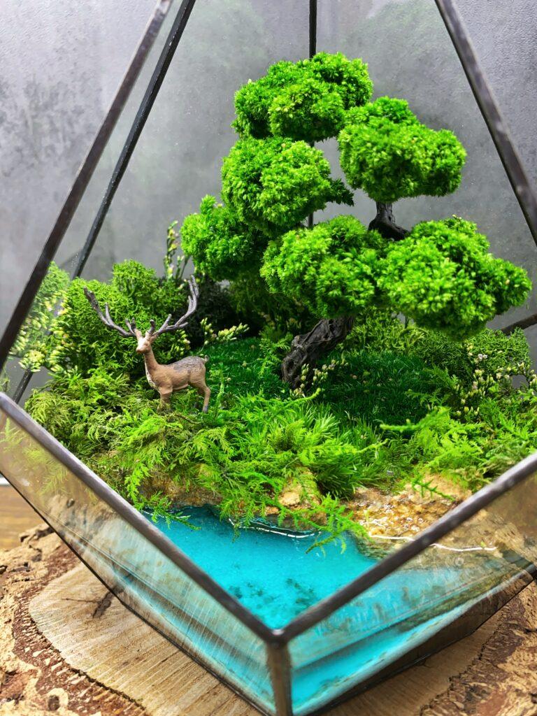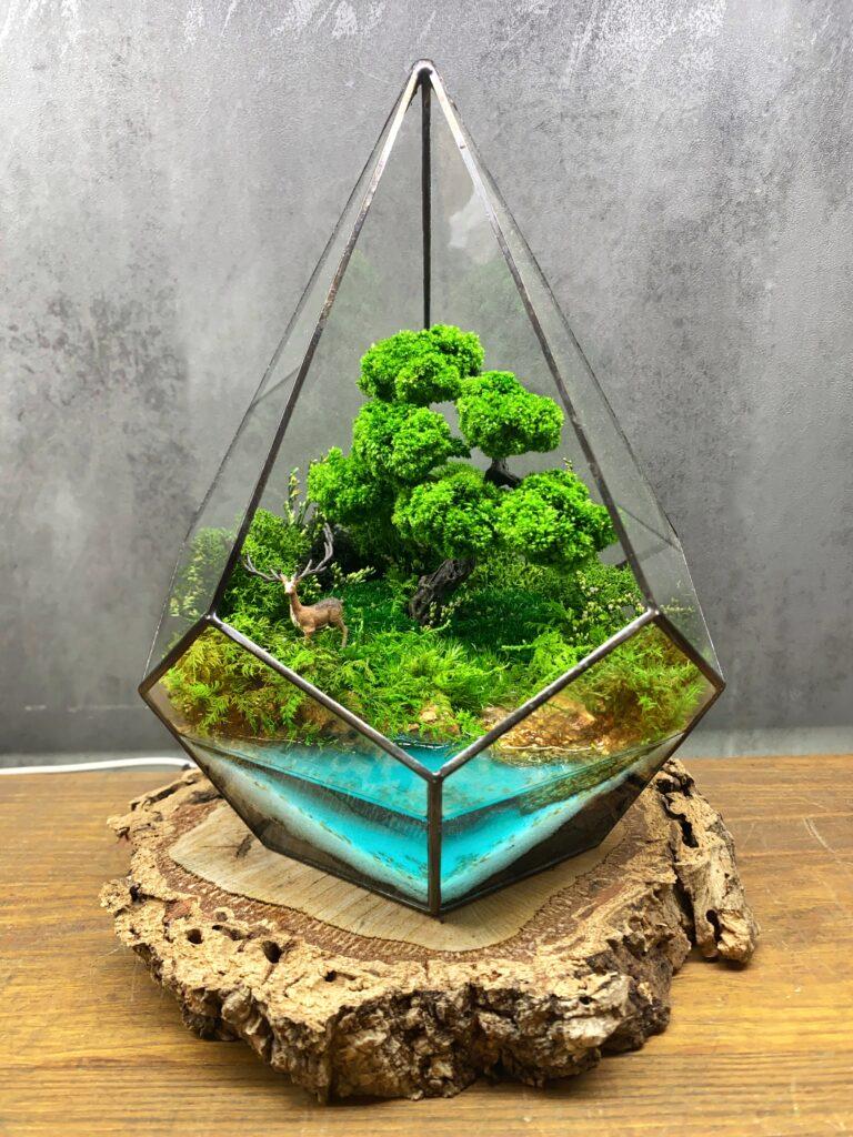 Мосаріум виготовлений зі стабілізованих рослин. Не вимагає догляду, поливу та сонячного світла.